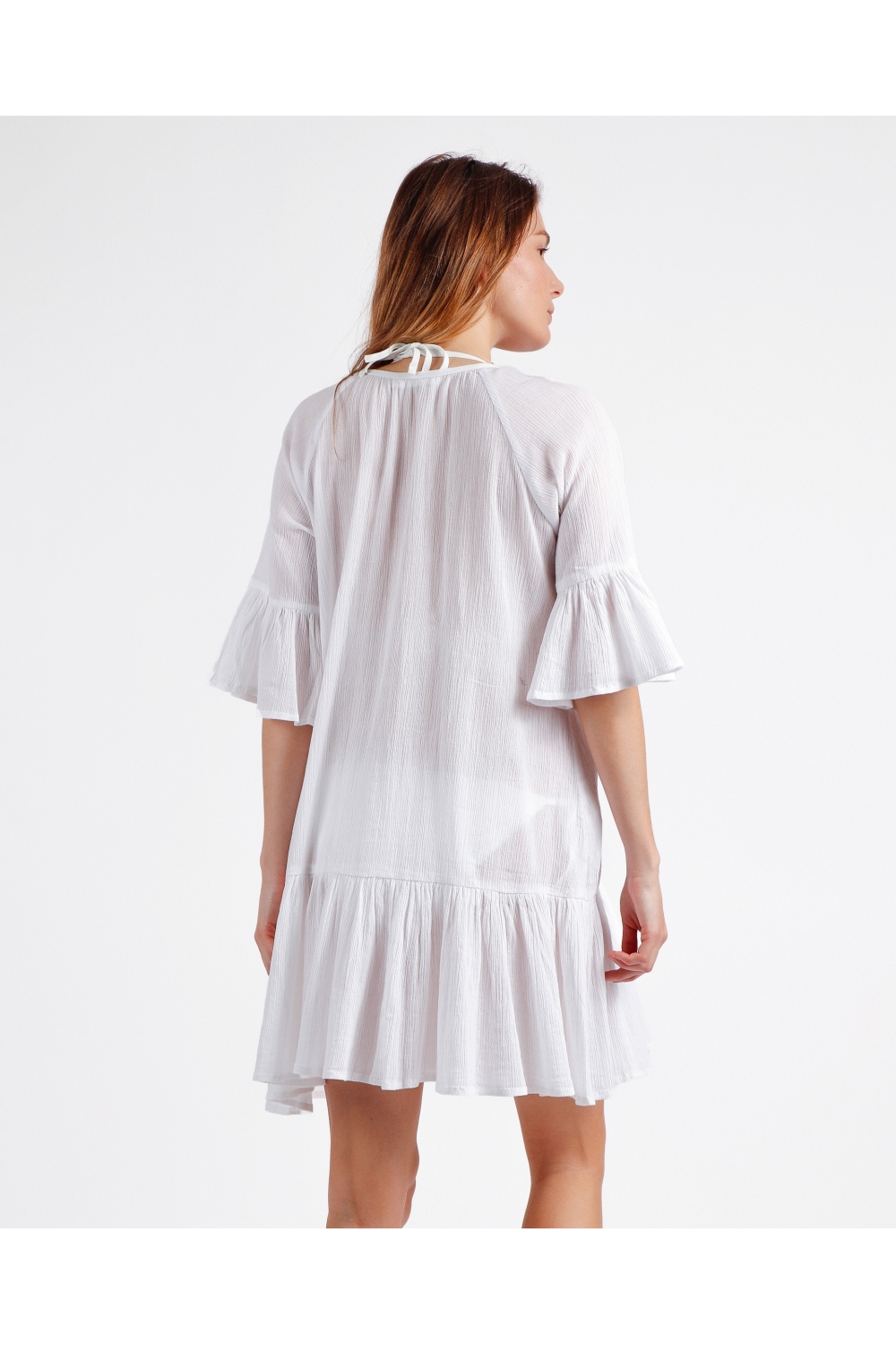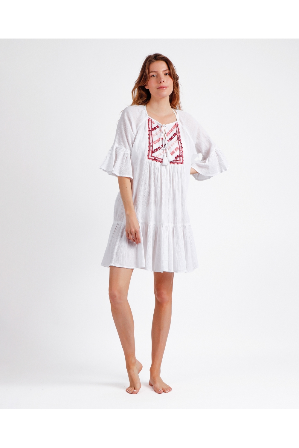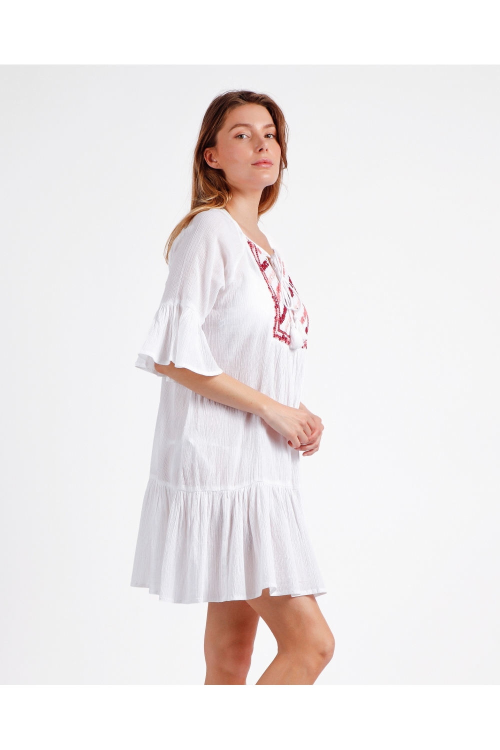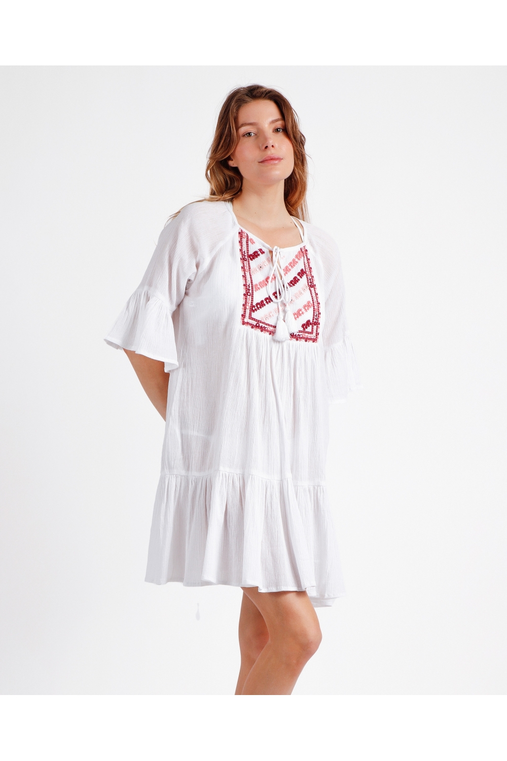 * Vestido para mujer de tela de algodón, con detalles bordados y pompones, lo que le da un aire artesano a la prenda.