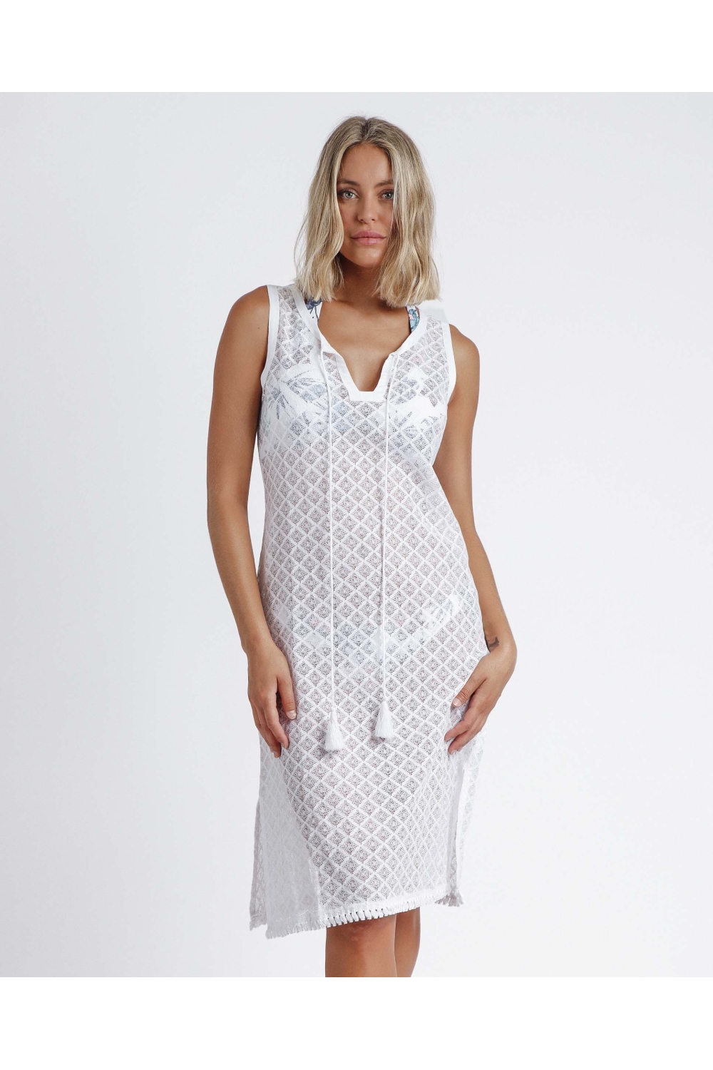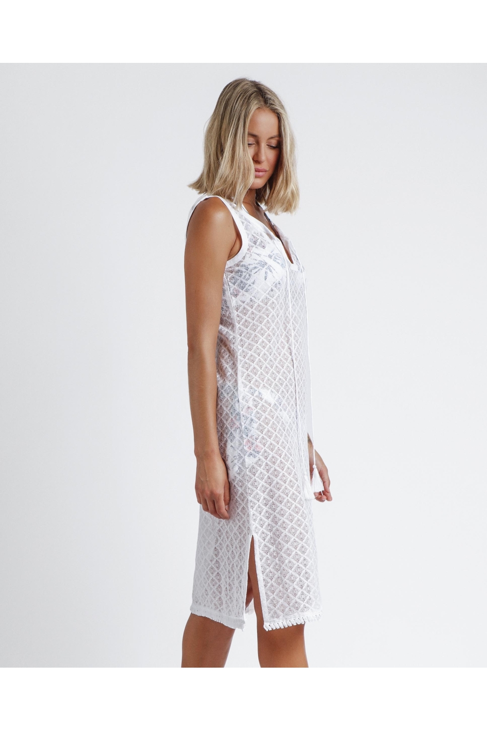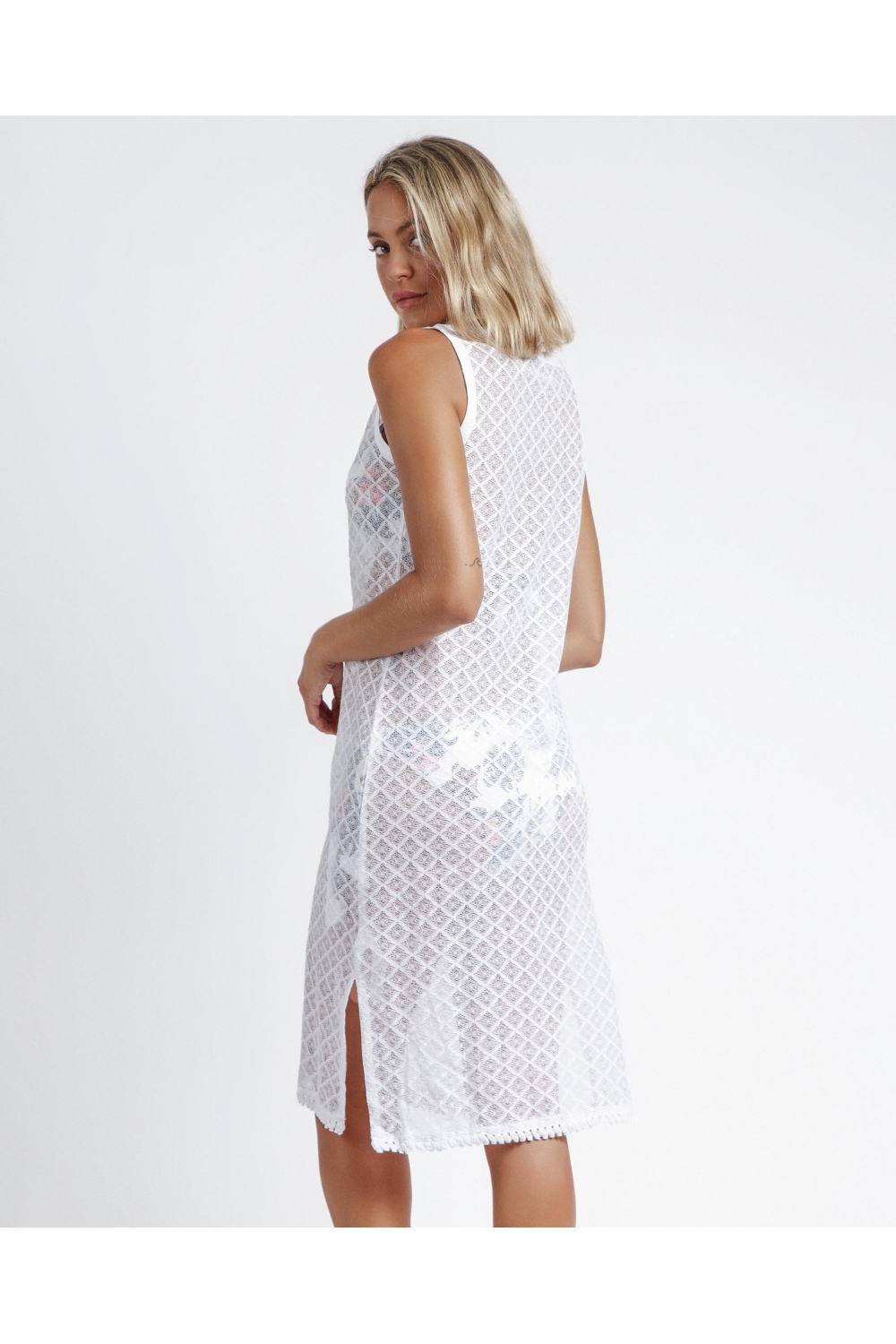 * Vestido de playa para mujer tipo crochet, lo que le da un aire artesano a la prenda, en dos combinaciones de color: blanco y negro.