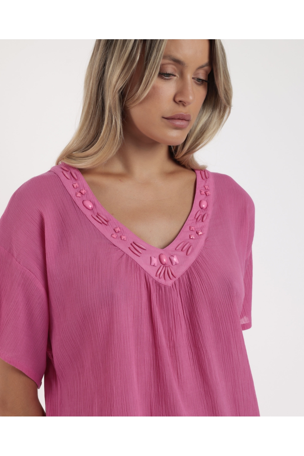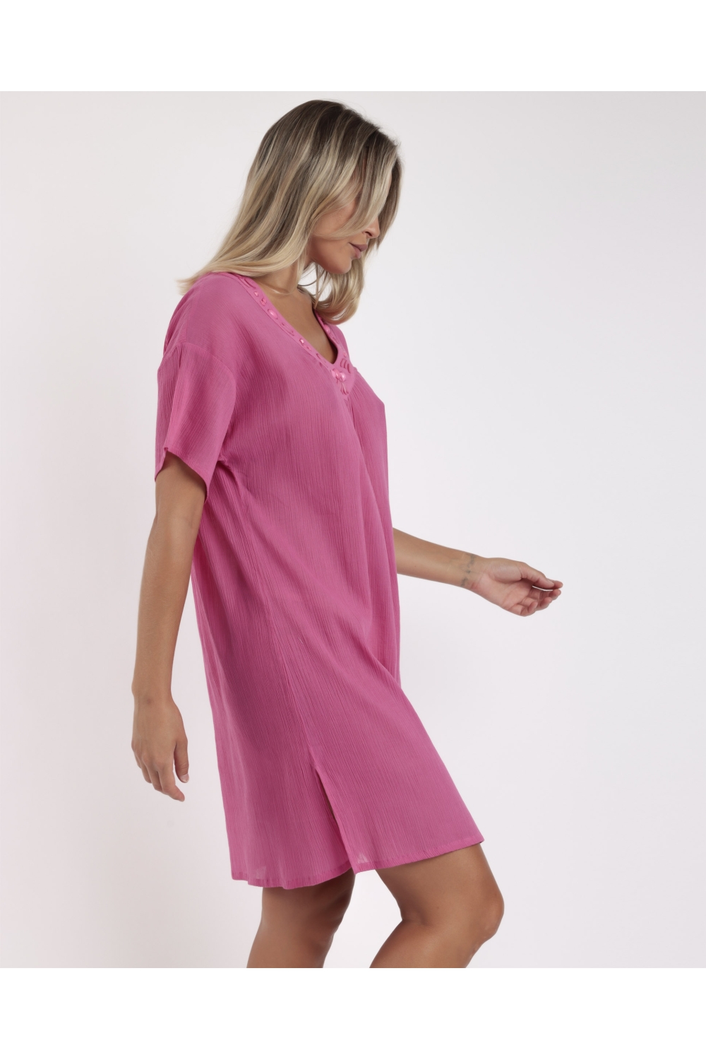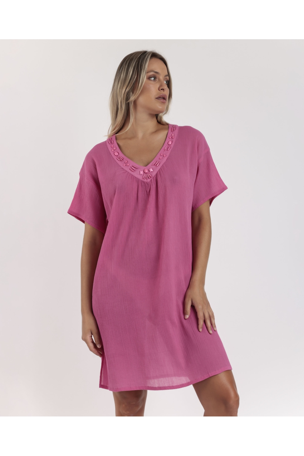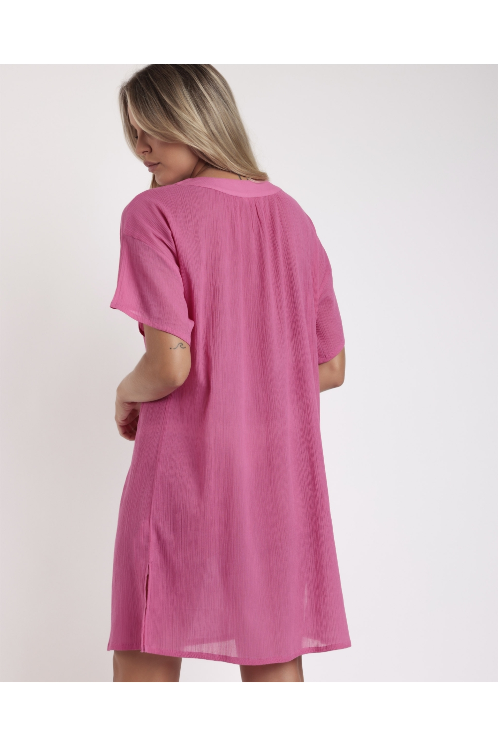 * Vestido corto para mujer de tela de algodón y manga corta con escote pico.