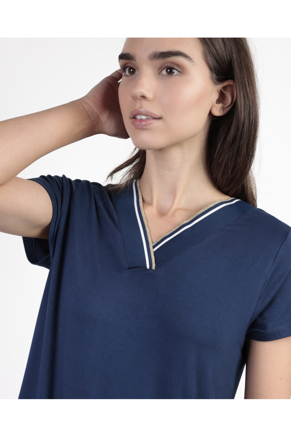 * Vestido corto para mujer de punto viscosa, manga corta y cuello pico a contraste.
