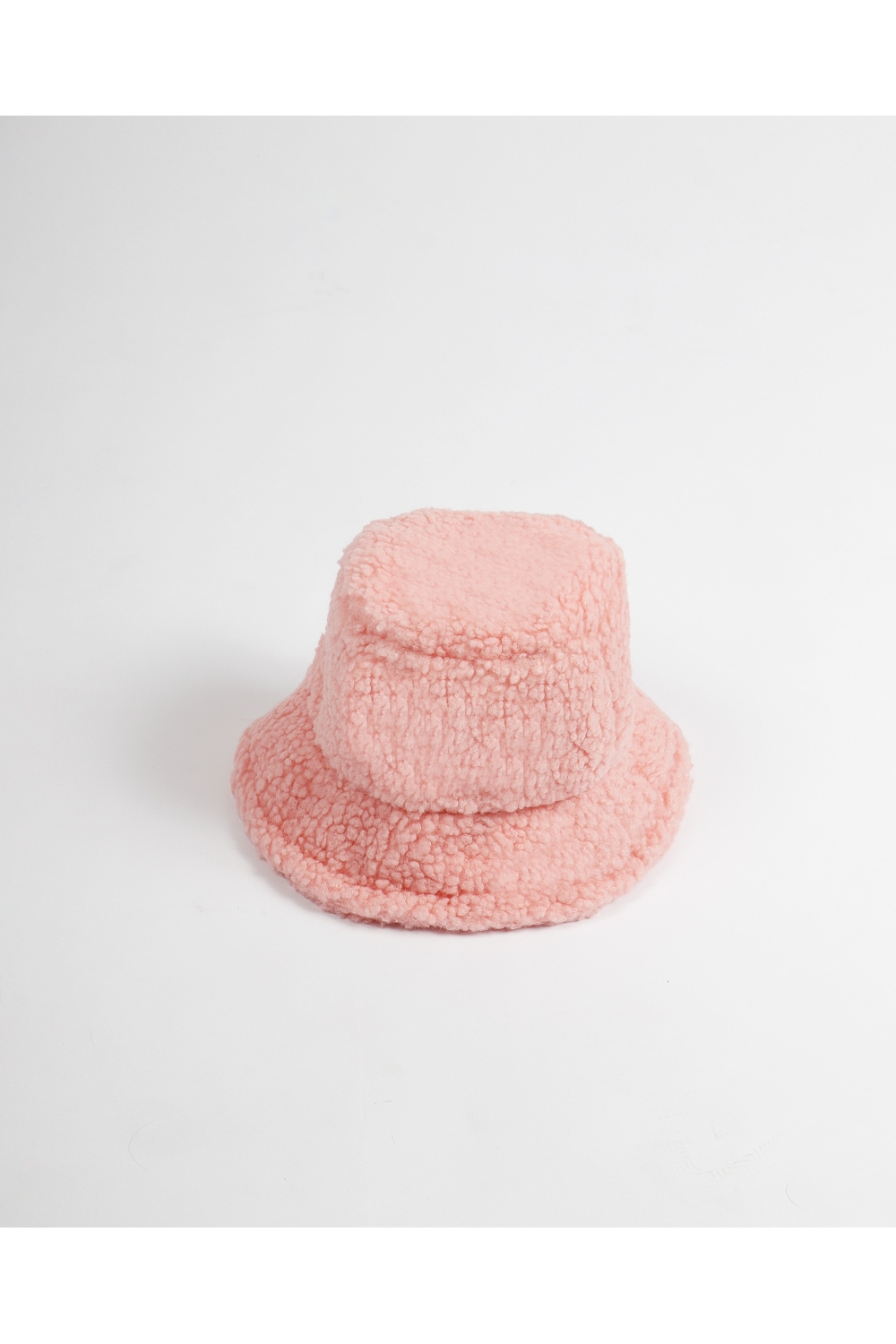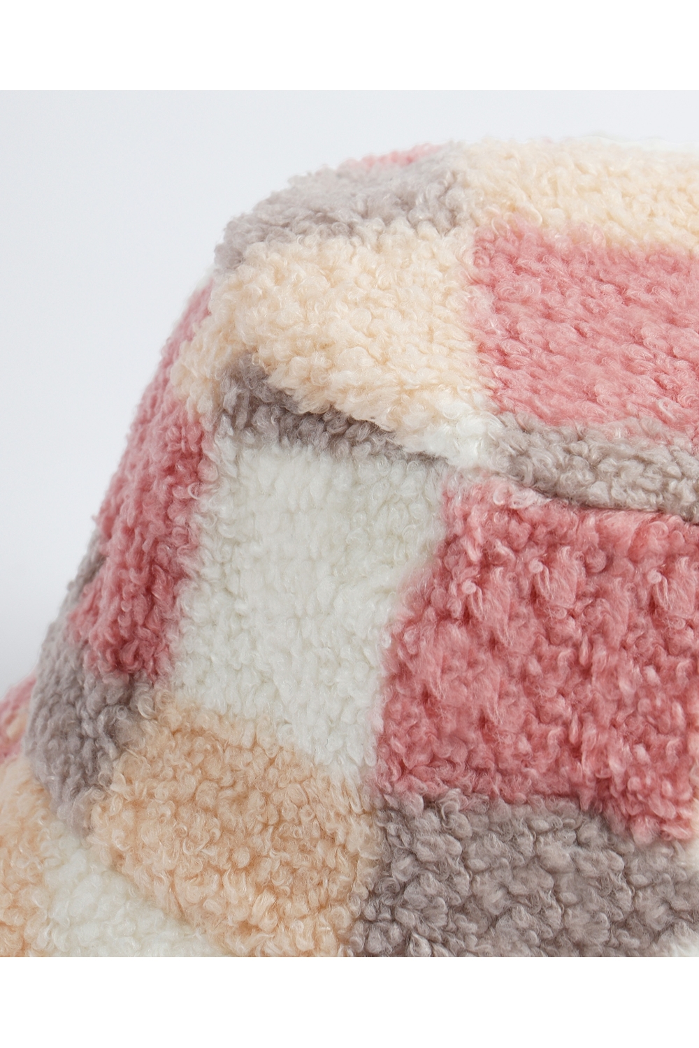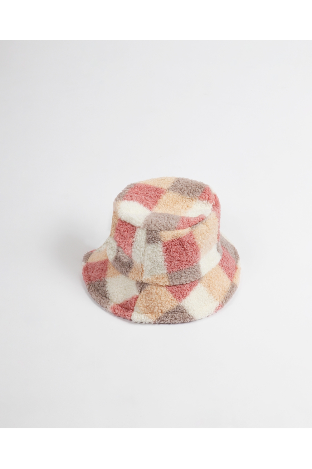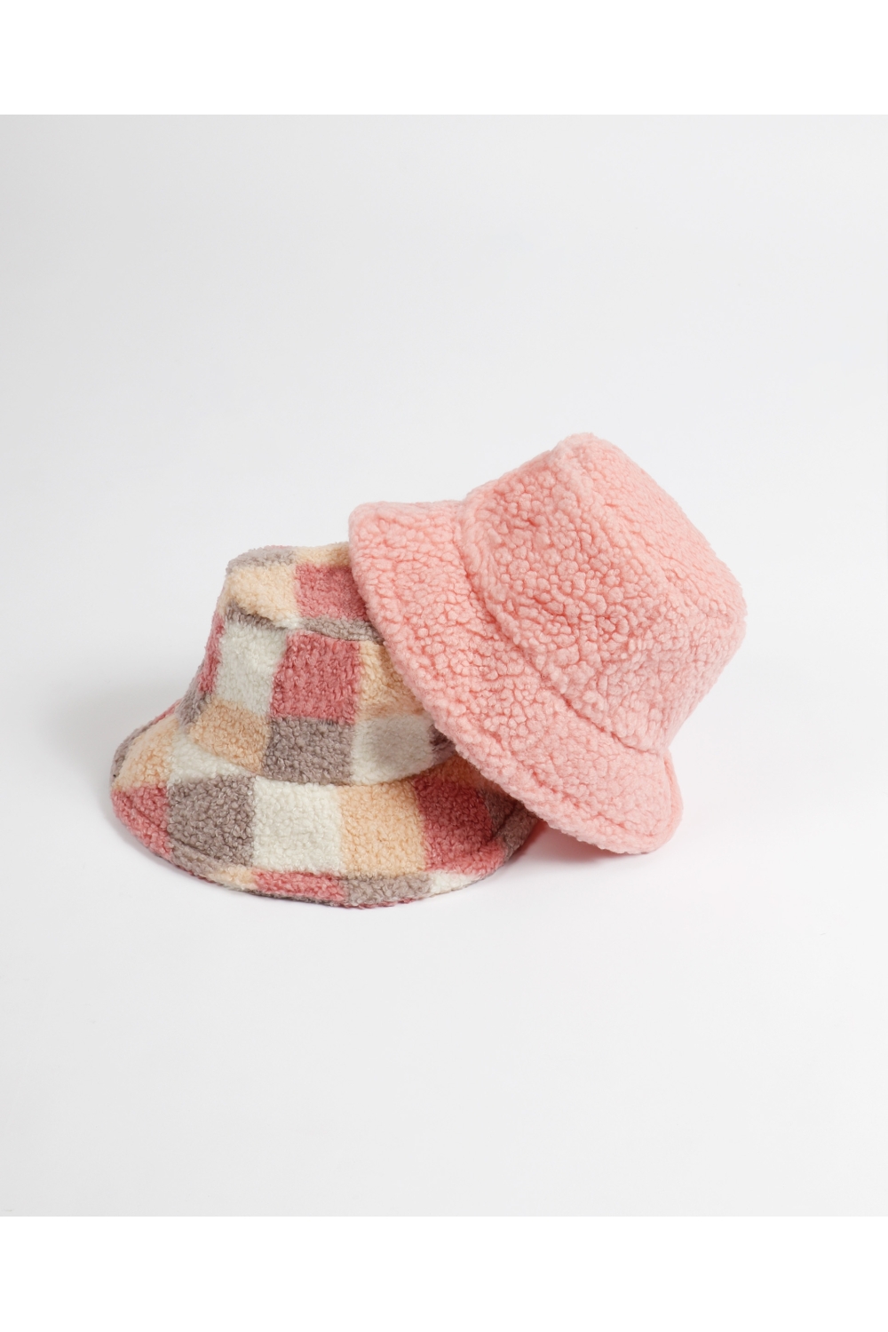 Pack de dos sombreros estilo bucket, uno en color rosa pastel y otro con estampado de cuadros en tonos neutros.
