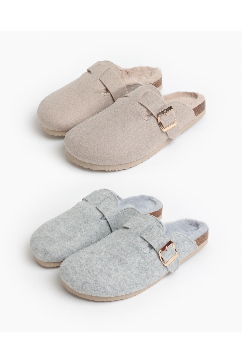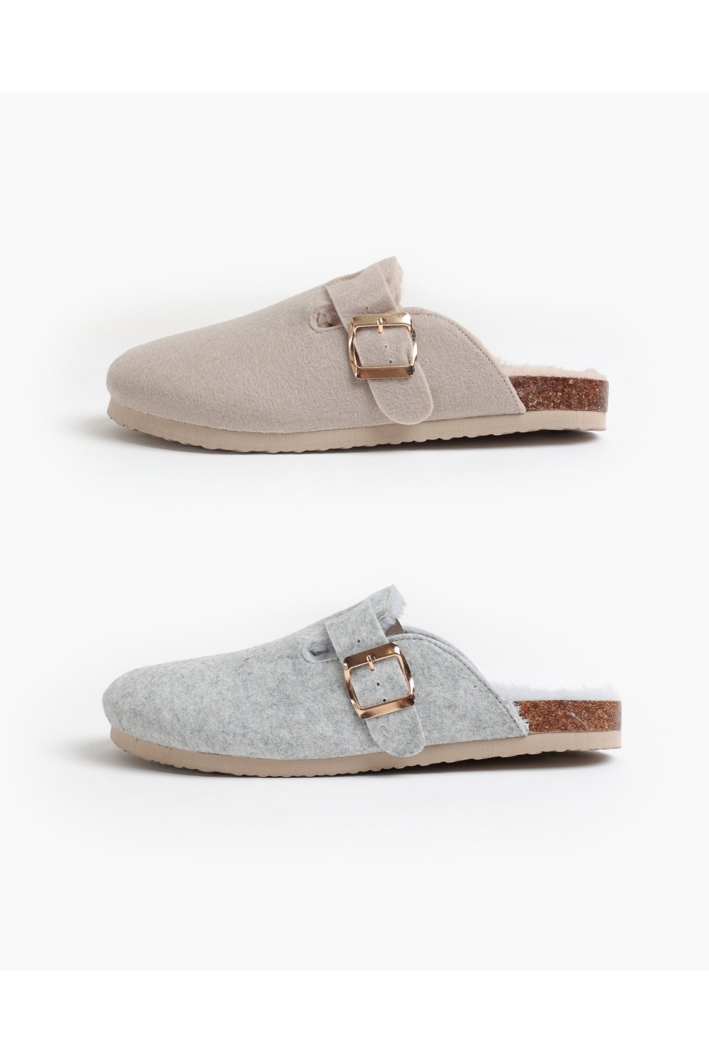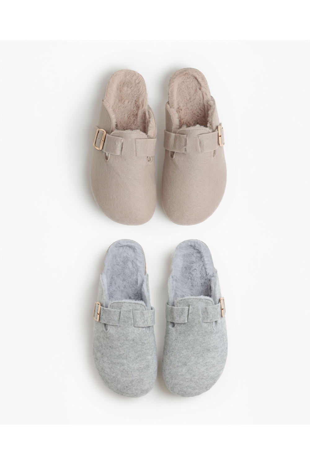 * Zapatillas de estar por casa, tipo zuecos, de tejido cálido, disponibles en dos combinaciones de color: beige y gris.