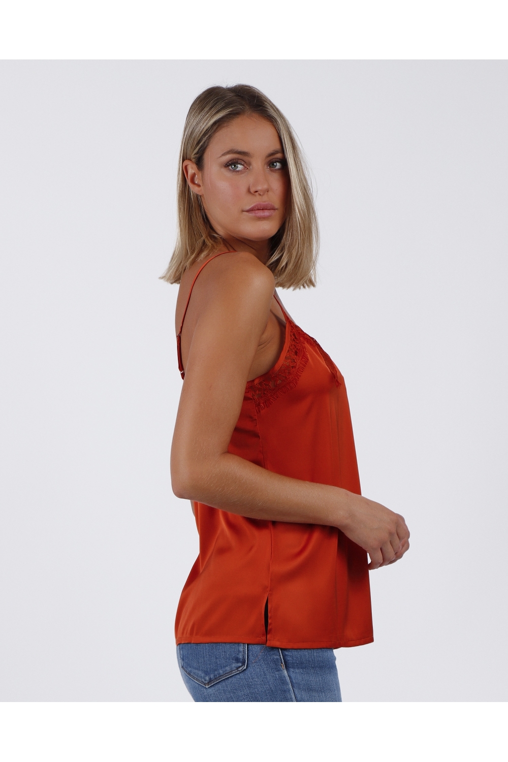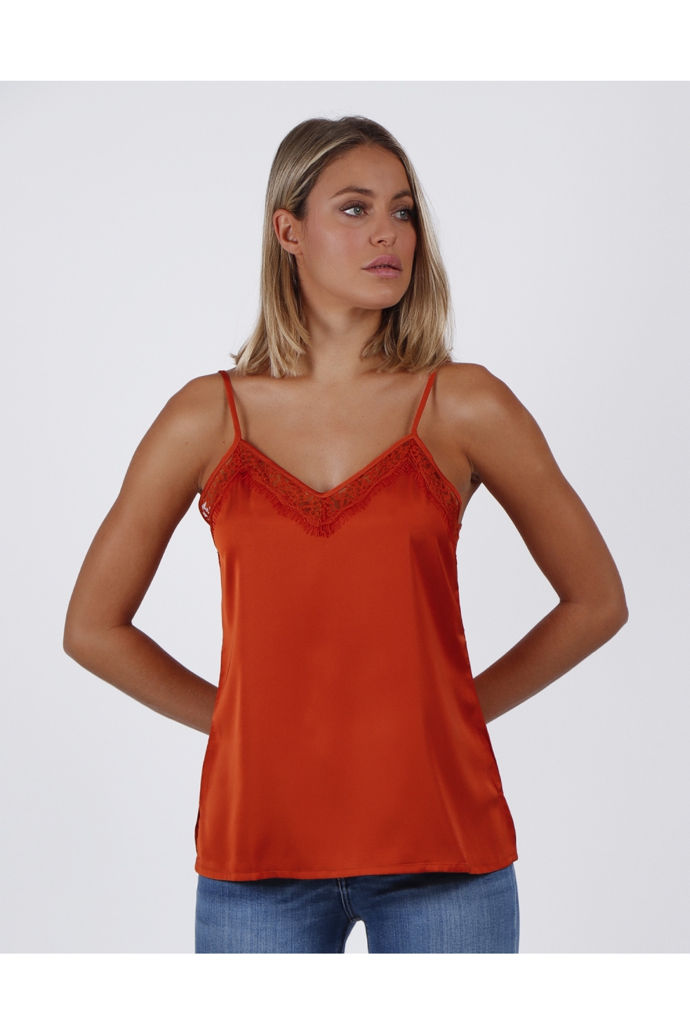 * Camiseta de tela de raso de tirantes y con escote pico con detalles de puntilla lencera.