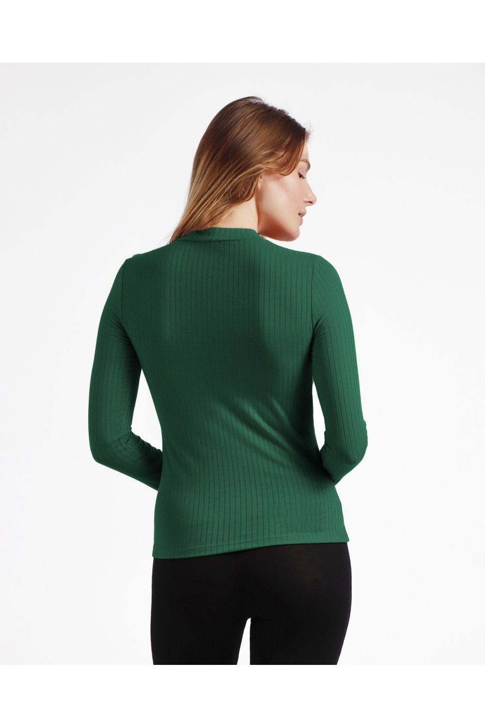 * Camiseta canalé, de punto, de manga larga, con cuello perkins, en tres combinaciones de color: negro, caldera y verde.