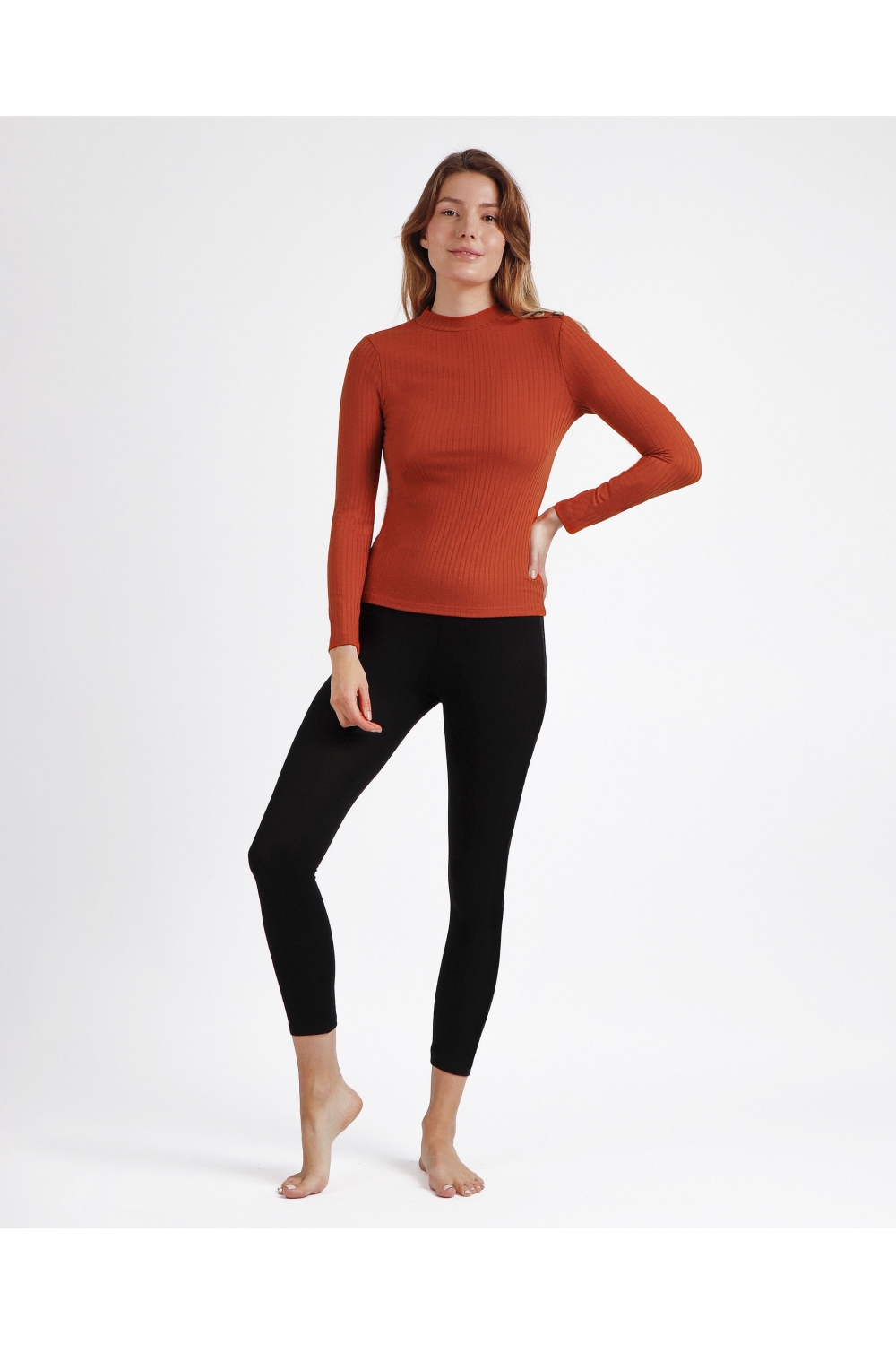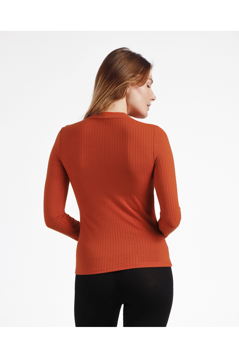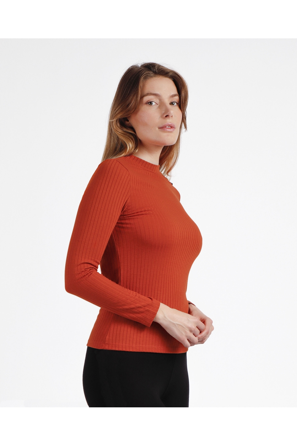 * Camiseta canalé, de punto, de manga larga, con cuello perkins, en tres combinaciones de color: negro, caldera y verde.