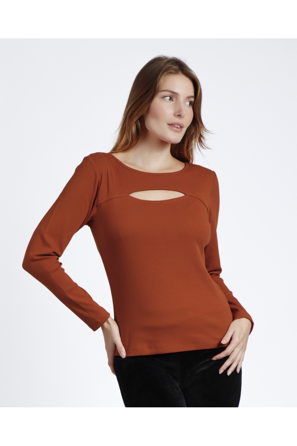 * Camiseta canalé, de punto, de manga larga, con cuello tipo barca y apertura frontal, en tres combinaciones de color: negro, caldera y verde.