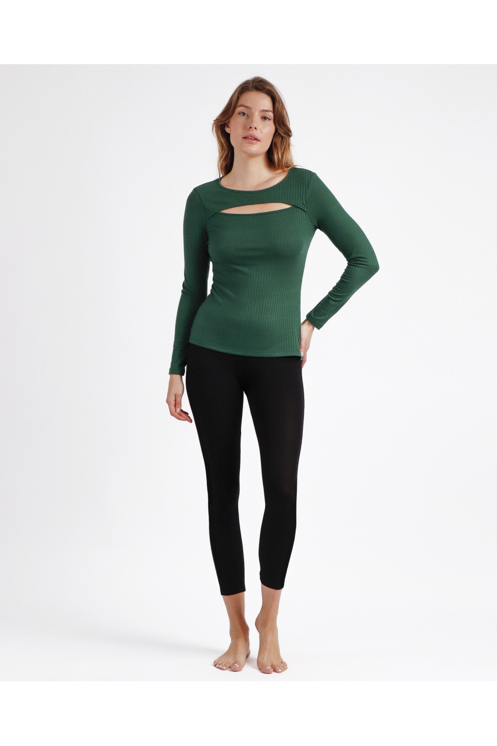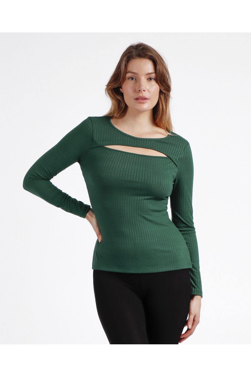 * Camiseta canalé, de punto, de manga larga, con cuello tipo barca y apertura frontal, en tres combinaciones de color: negro, caldera y verde.