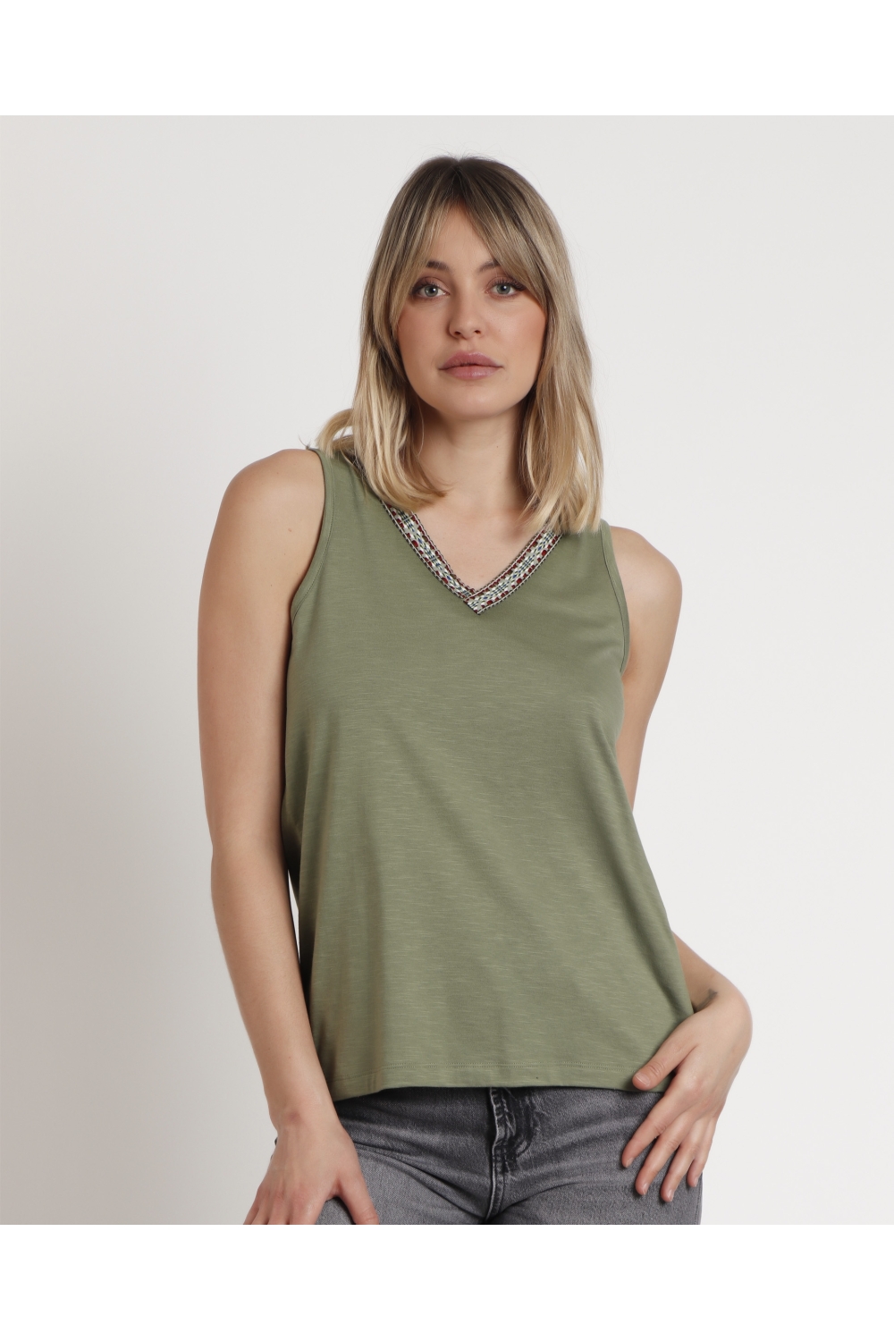 * Camiseta de punto de algodón, sin mangas y con escote pico, con detalles bordados.