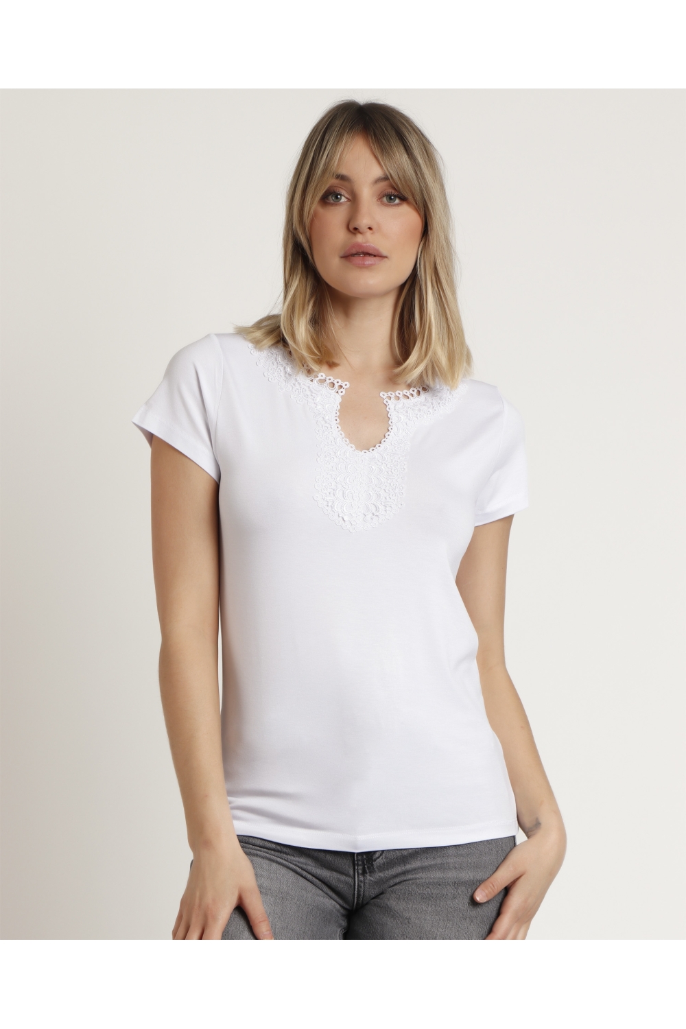 * Camiseta de punto viscosa, de manga corta y con cuello con detalles de puntilla guipur, de color negro.
