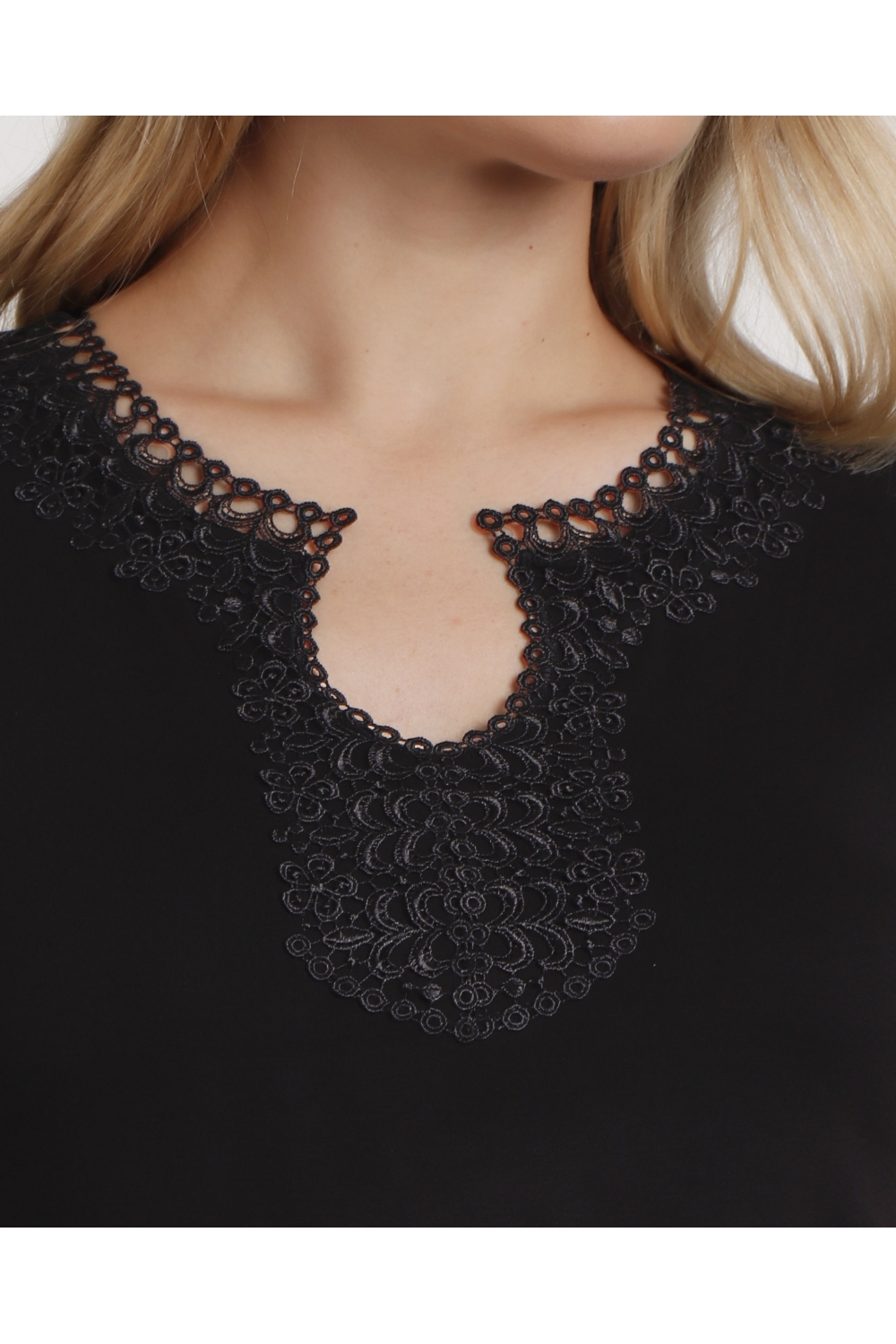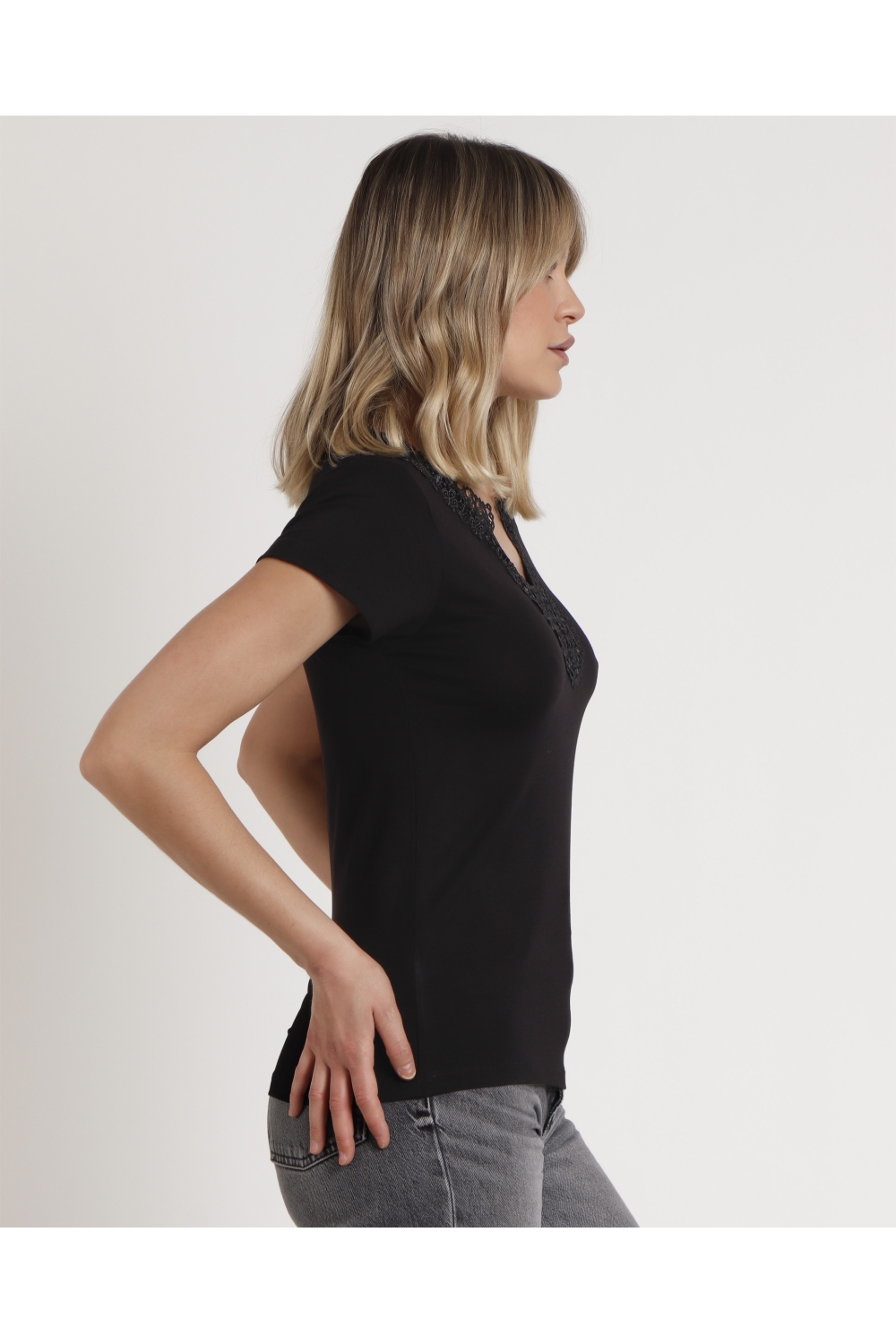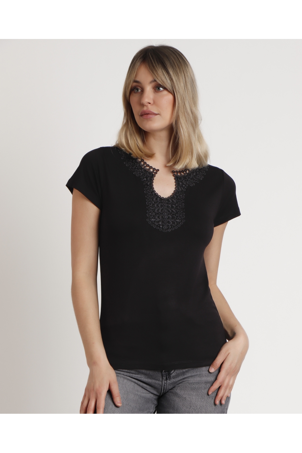 * Camiseta de punto viscosa, de manga corta y con cuello con detalles de puntilla guipur, de color negro.