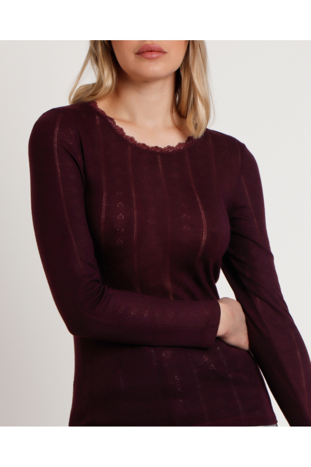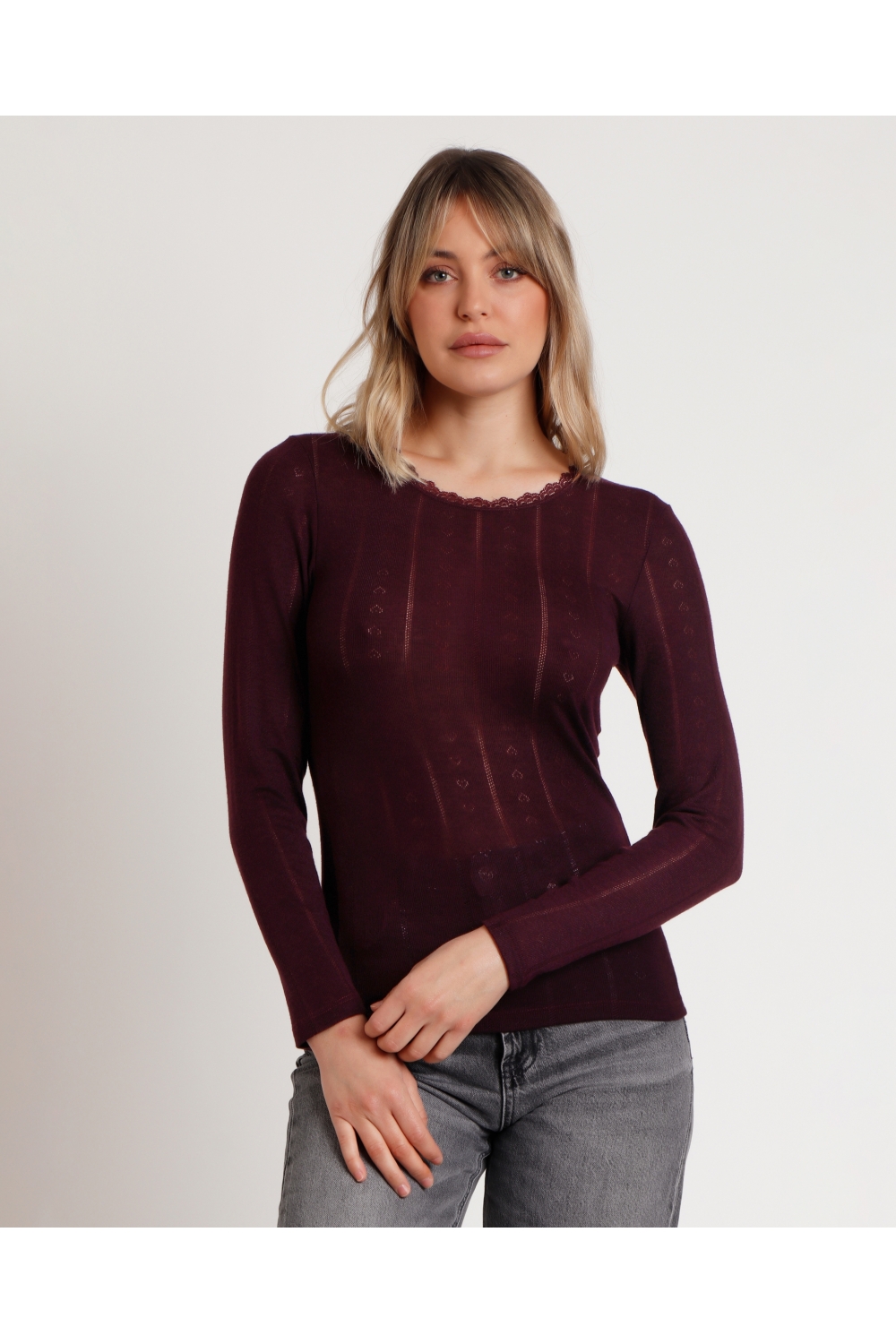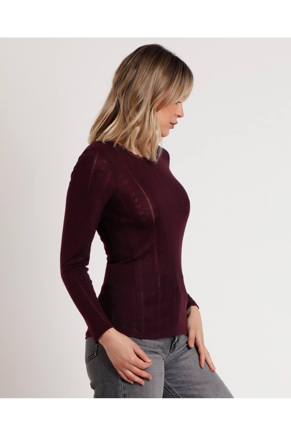 * Camiseta canalé, de punto, de manga larga y con escote redondo con detalles de puntilla lencera.