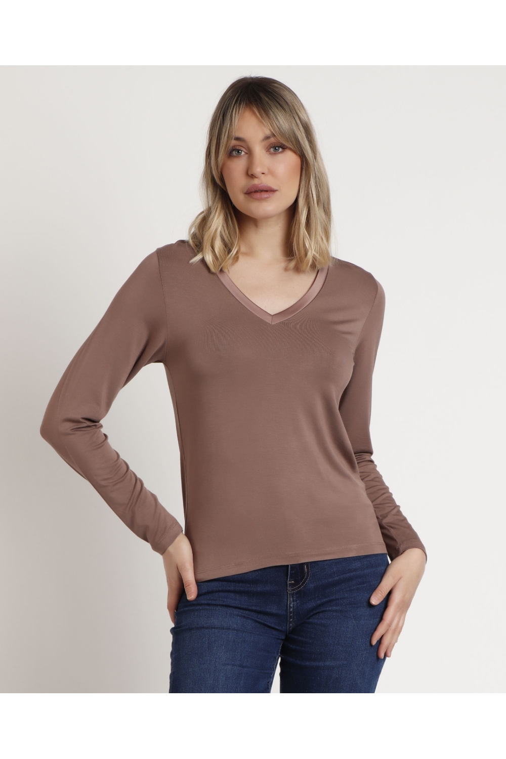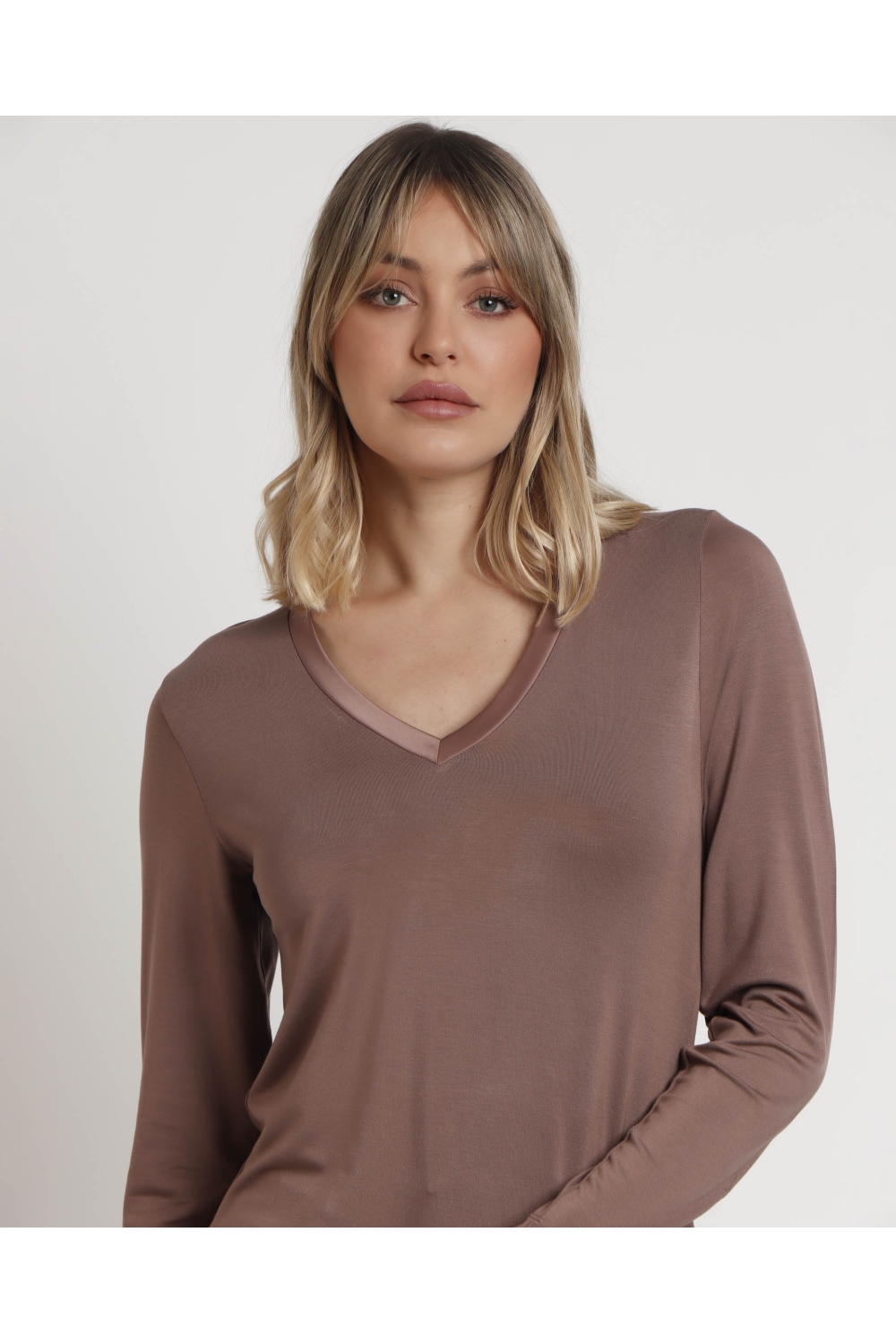 * Camiseta de punto de viscosa, de manga larga y con escote con detalles de raso.