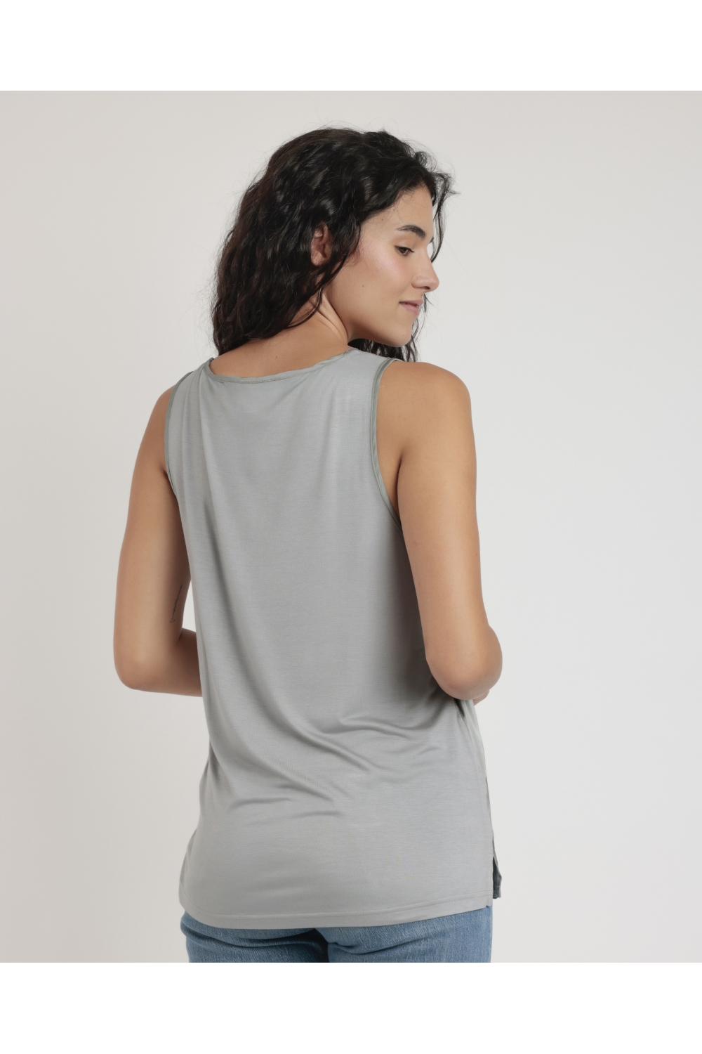 * Camiseta sin mangas y escote pico, en dos combinaciones de color: perla y cobre.