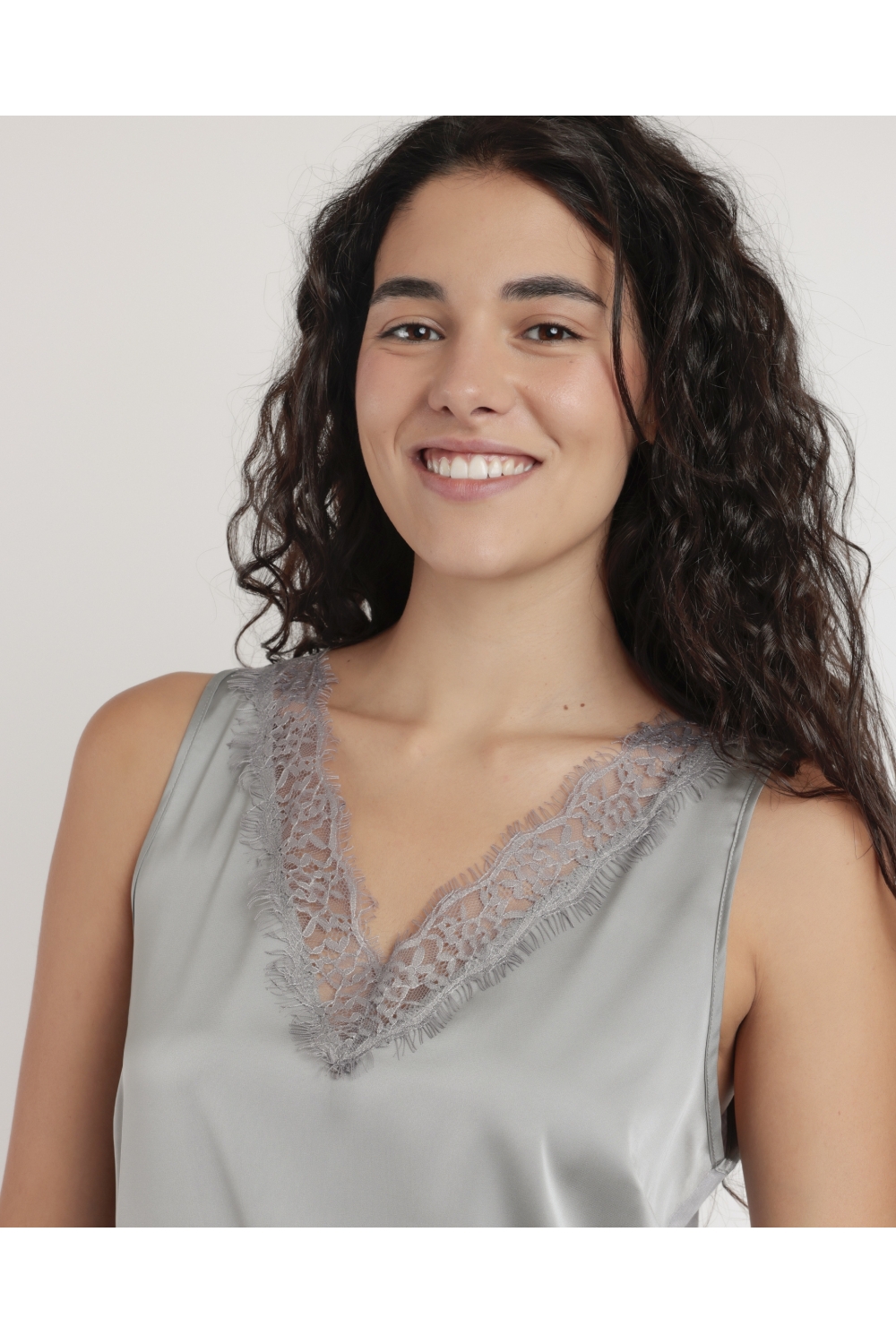 * Camiseta con parte delantera de tejido de satén y espalda de punto de viscosa, con detalles de puntilla lencera, personalizada de la marca Admas.