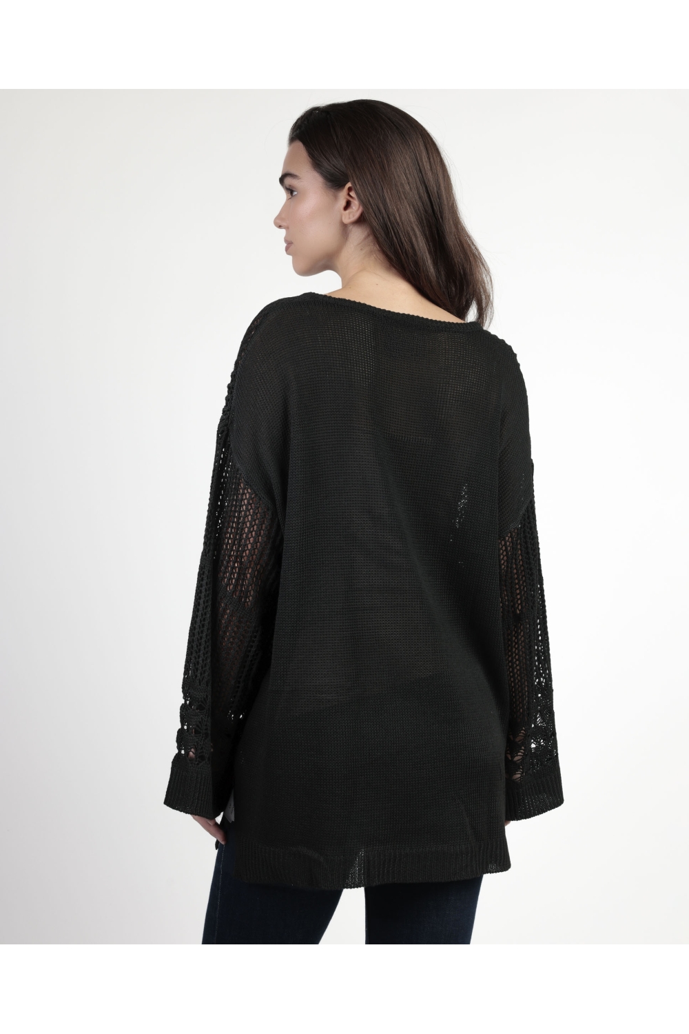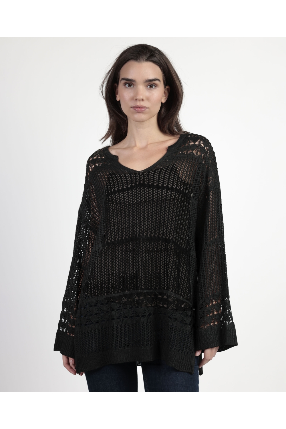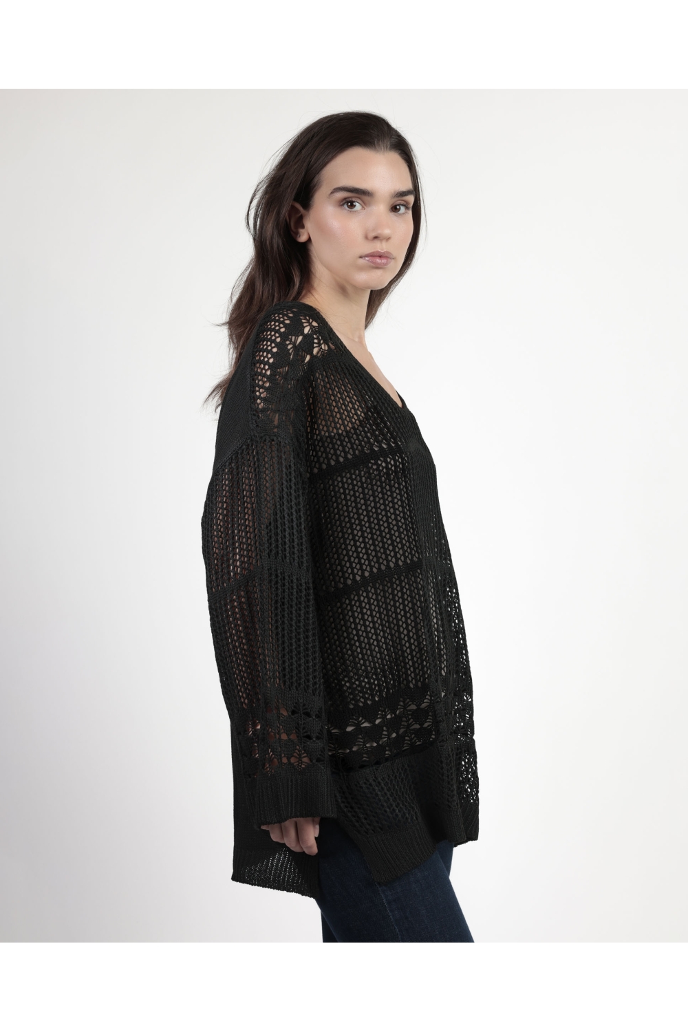 * Sueter crochet para mujer, de punto calado, de manga larga y cuello pico, disponible en dos combinaciones de color: beige y negro.