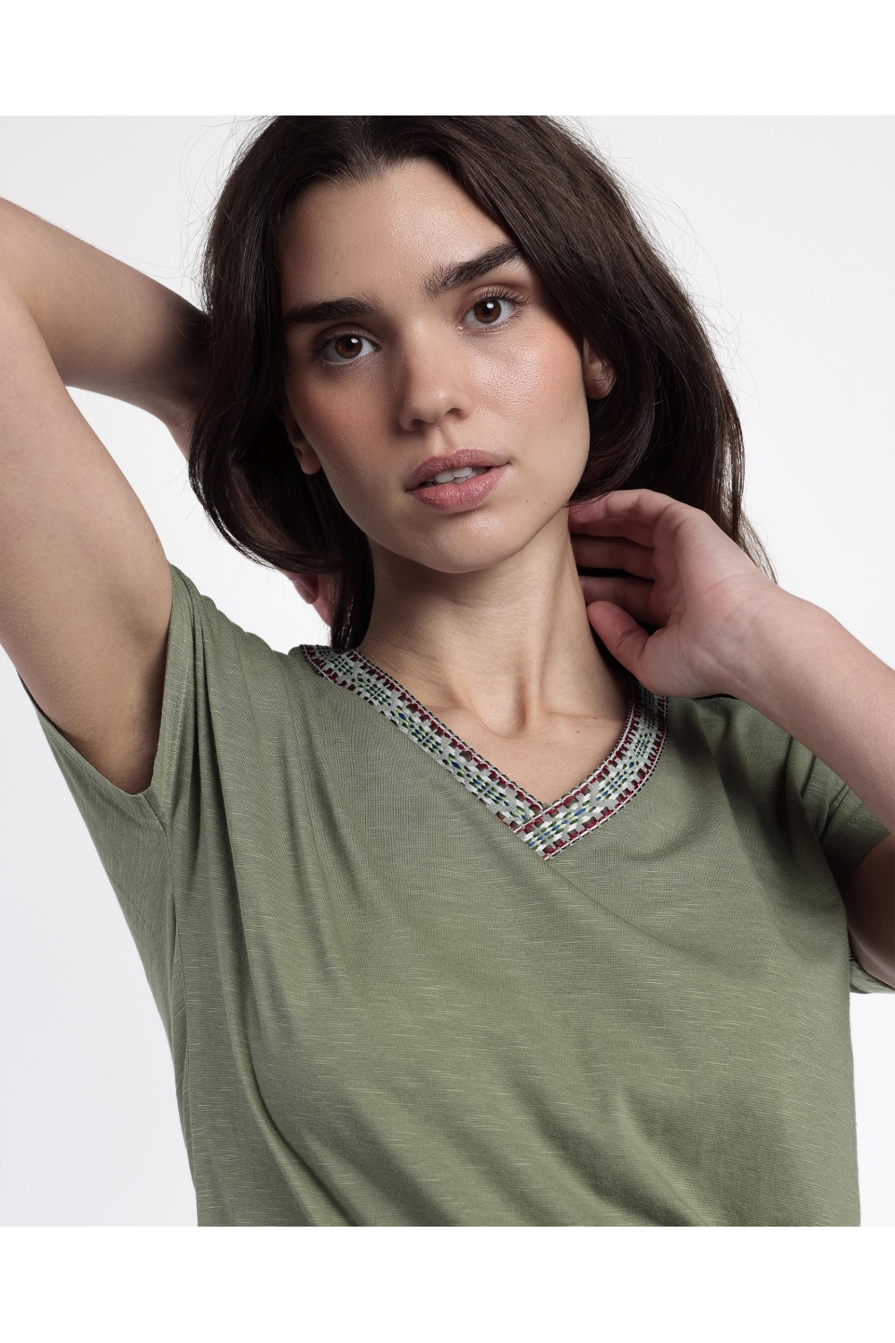 * Camiseta de manga caída para mujer, de punto liso, de cuello pico, con detalles bordados, disponible en cuatro combinaciones de color: crudo, caldera, azul y oliva.