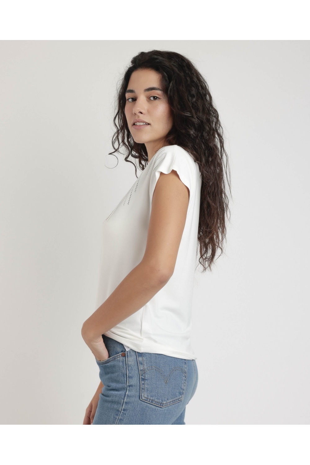 * Camiseta de manga corta para mujer, de cuello redondo, con detalles brillantes, disponible en dos combinaciones de color: negro y crudo.