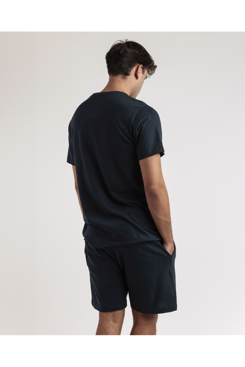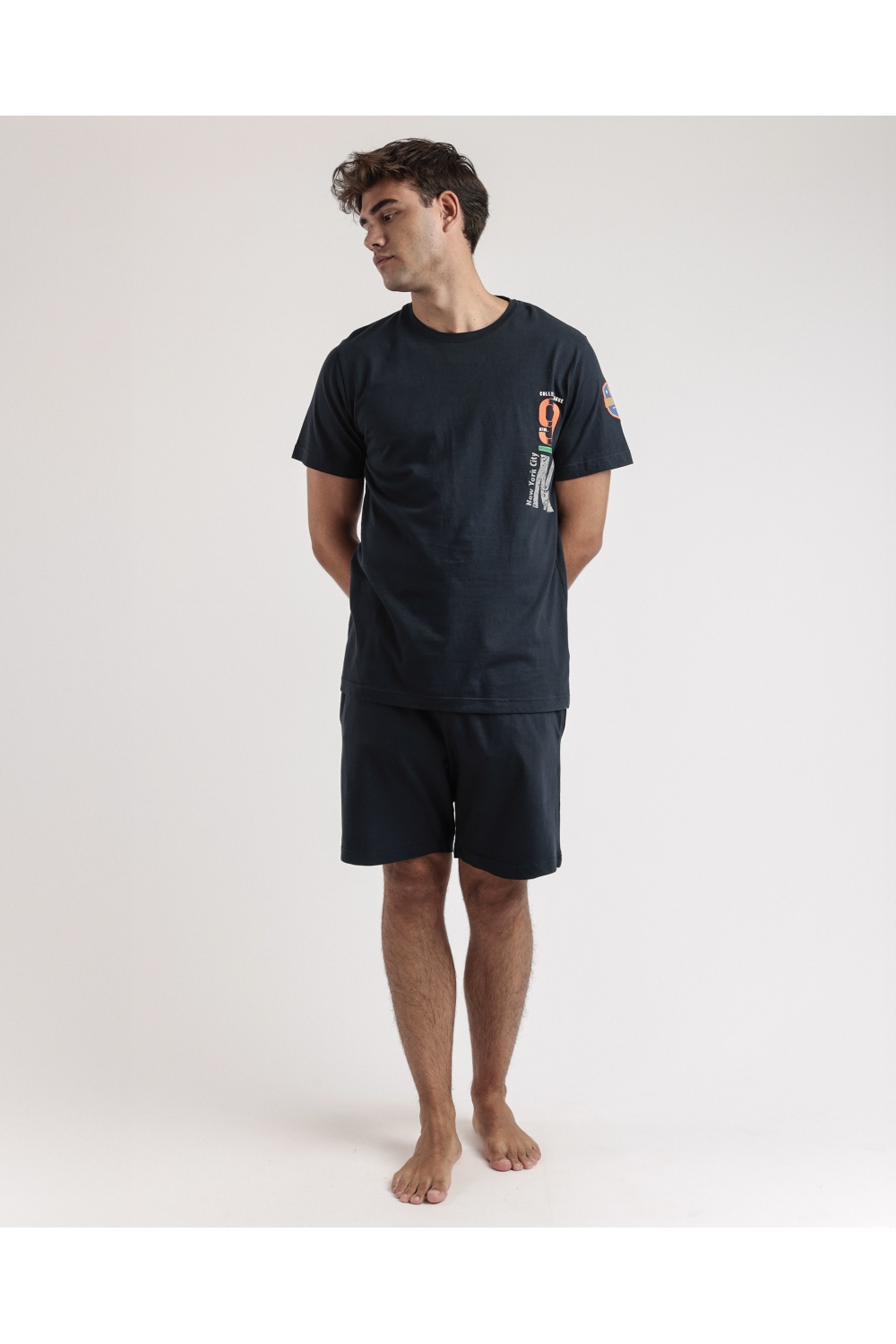 * Pijama de punto de algodón, de manga corta, cuello redondo y pantalón corto.