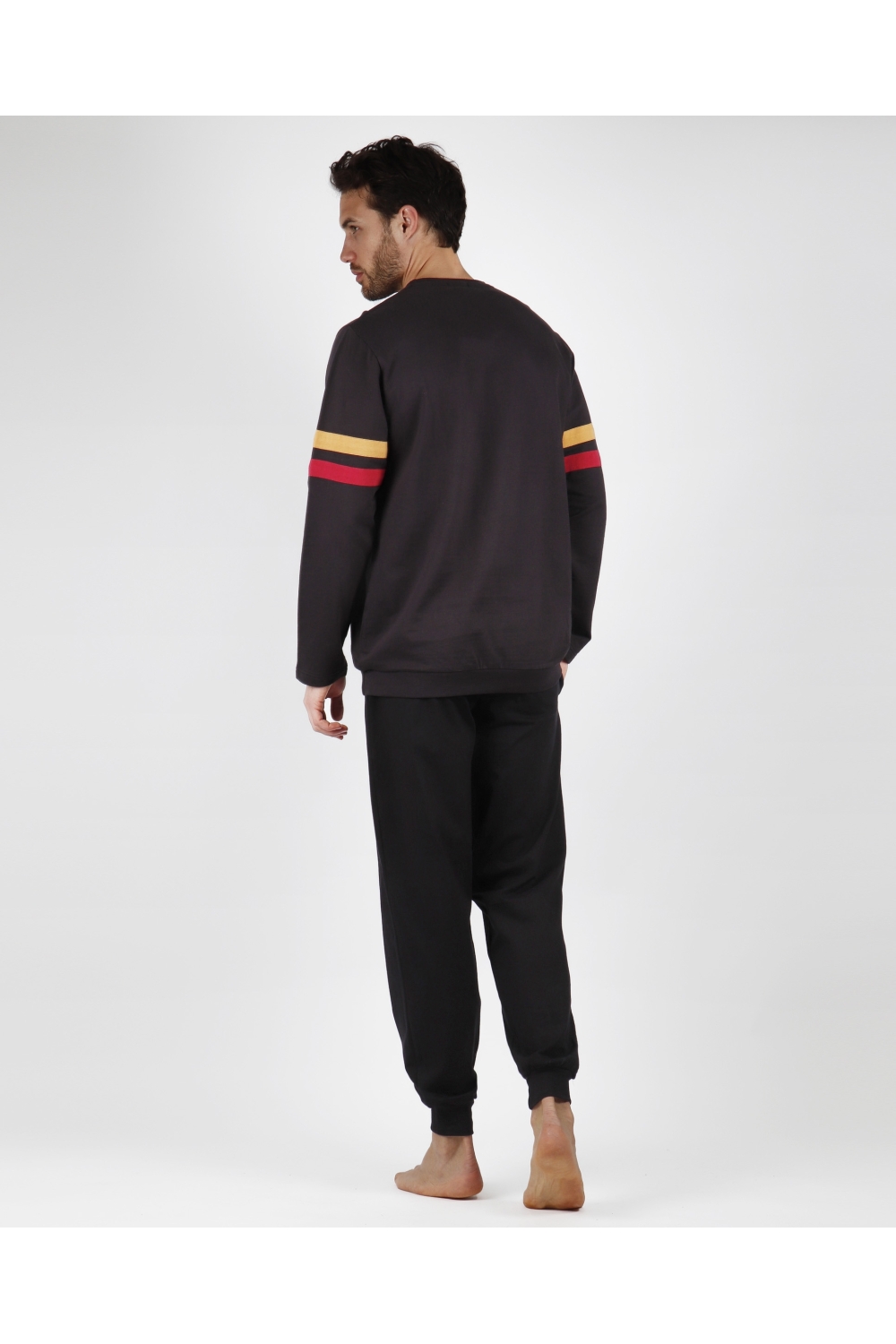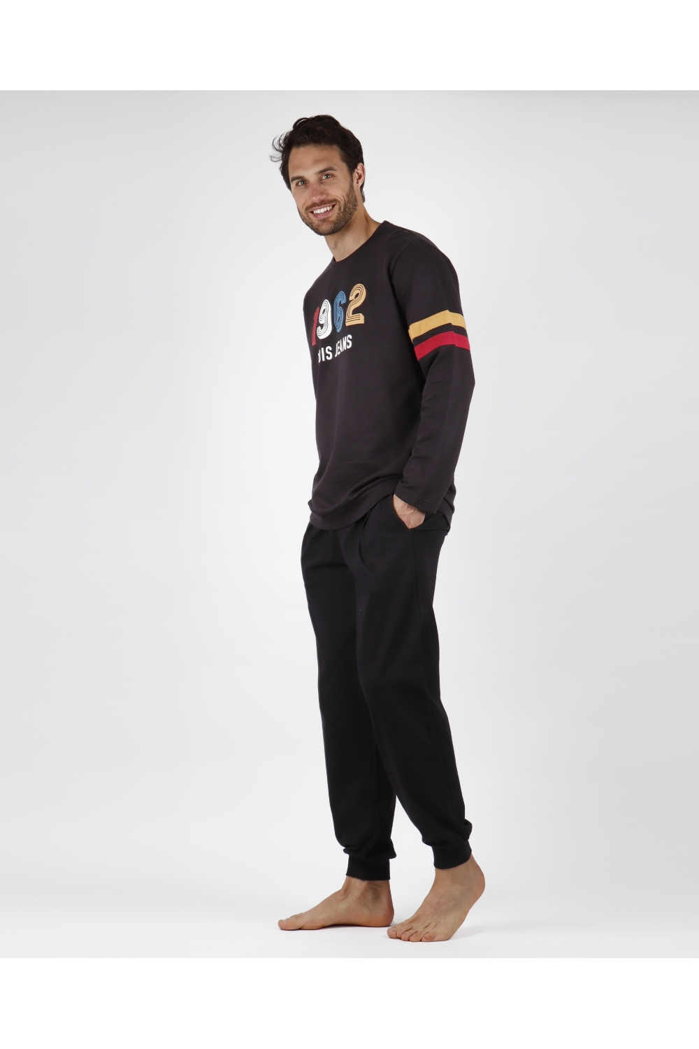 * Pijama de tejido felpa (tejido tipo chándal de algodón), de manga larga, cuello redondo y pantalón largo.
