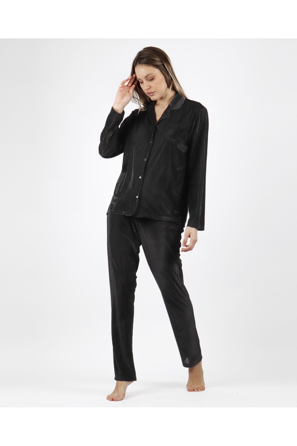 * Pijama abierto de tejido de terciopelo rayas, de manga larga y pantalón largo, en tres combinaciones de color: gris, rosa y negro.