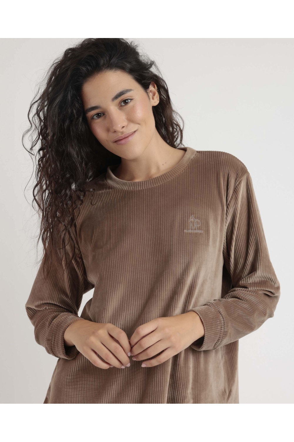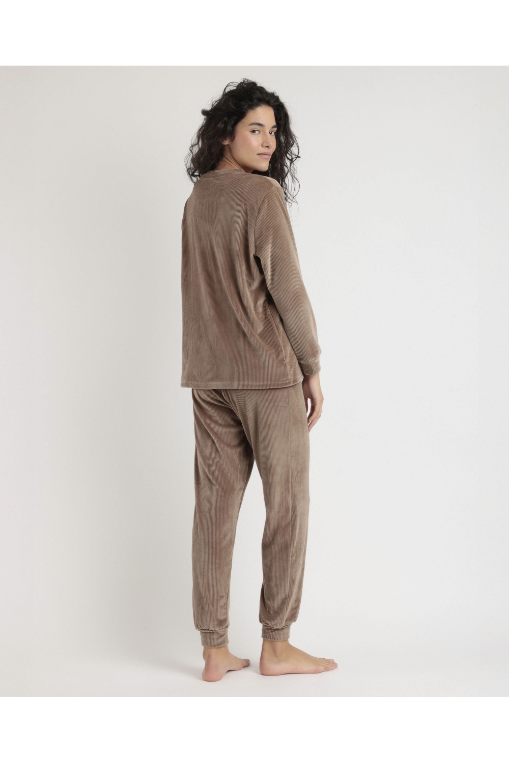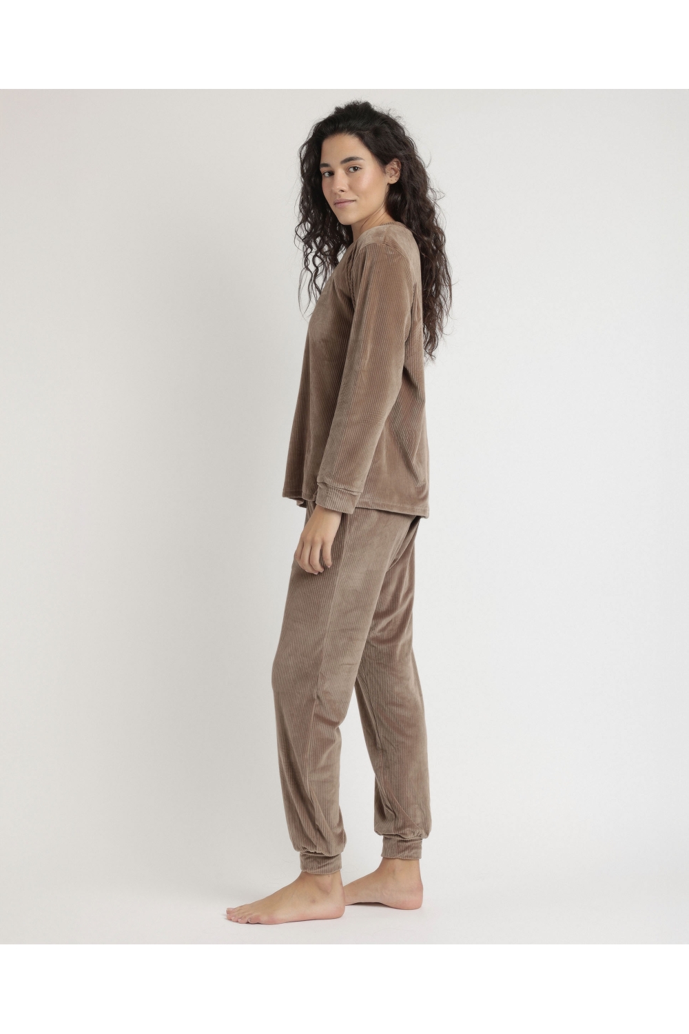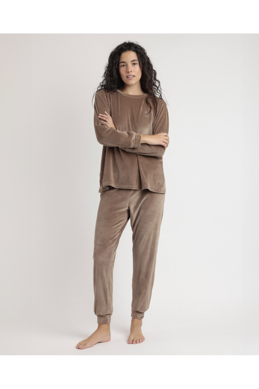 * Pijama de tejido especial ultraelástico de terciopelo con lycra canalé, de manga larga, cuello redondo y pantalón largo.