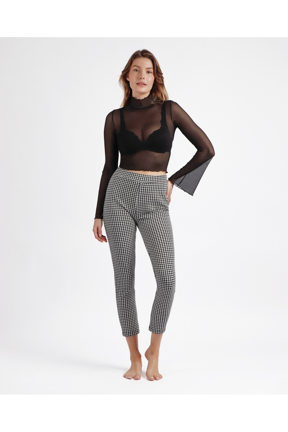 * Camiseta manga larga, de tul, para mujer, con cuello alto, disponible en color negro.