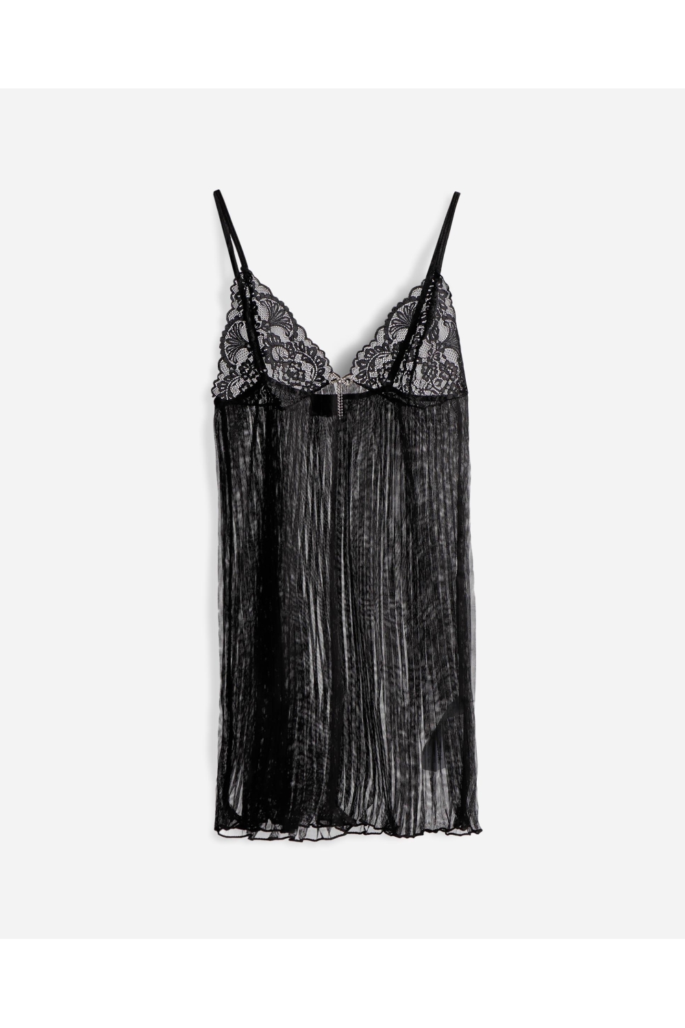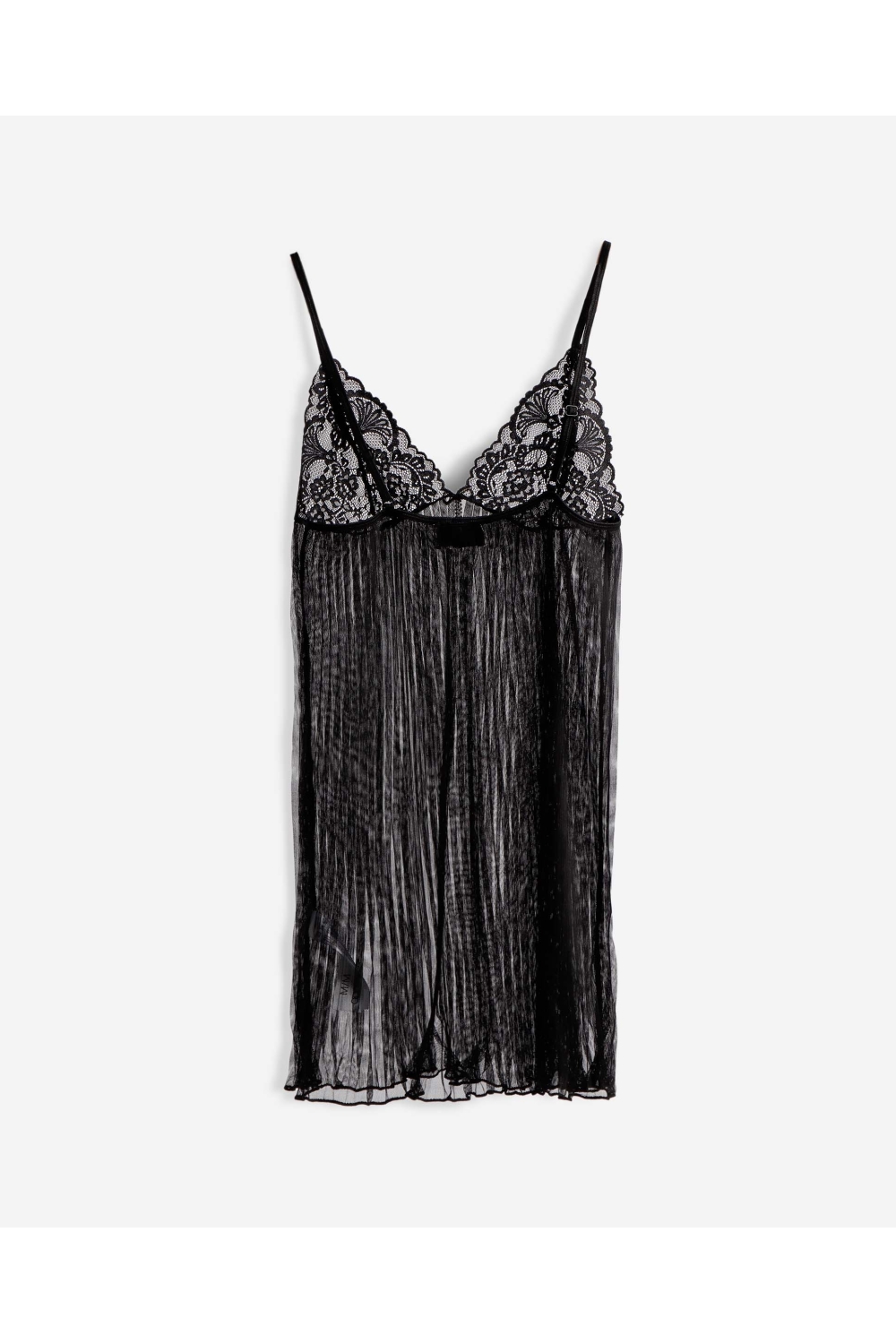 * Tentación plisada para mujer con detalles de puntilla, disponible en color negro.