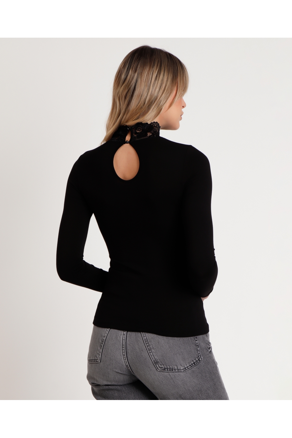 * Camiseta de manga larga, para mujer, de punto viscosa y cuello alto, con detalles de puntilla lencera, disponible en color negro.