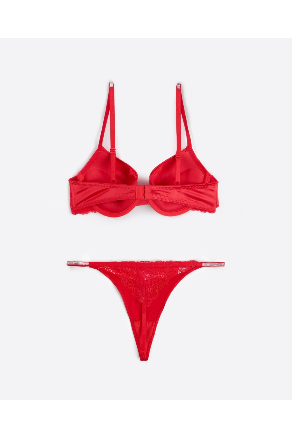 * Conjunto sujetador con push up, con detalles de encaje y tanga con puntilla, disponible en dos combinaciones de color: rojo y negro.