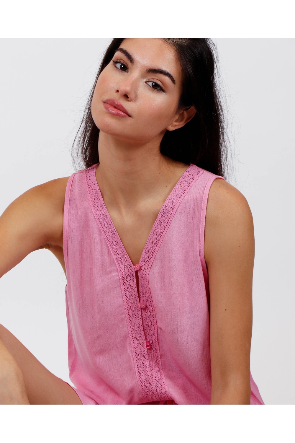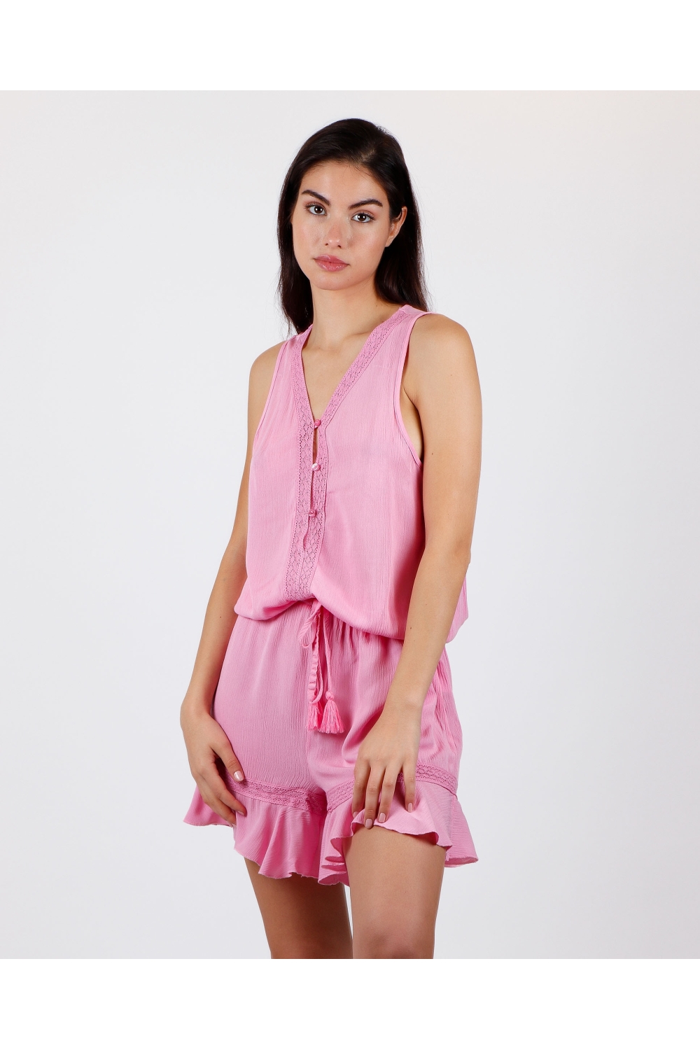 * Mono sin mangas, para mujer de tela viscosa, con detalles de puntilla crochet y pompones