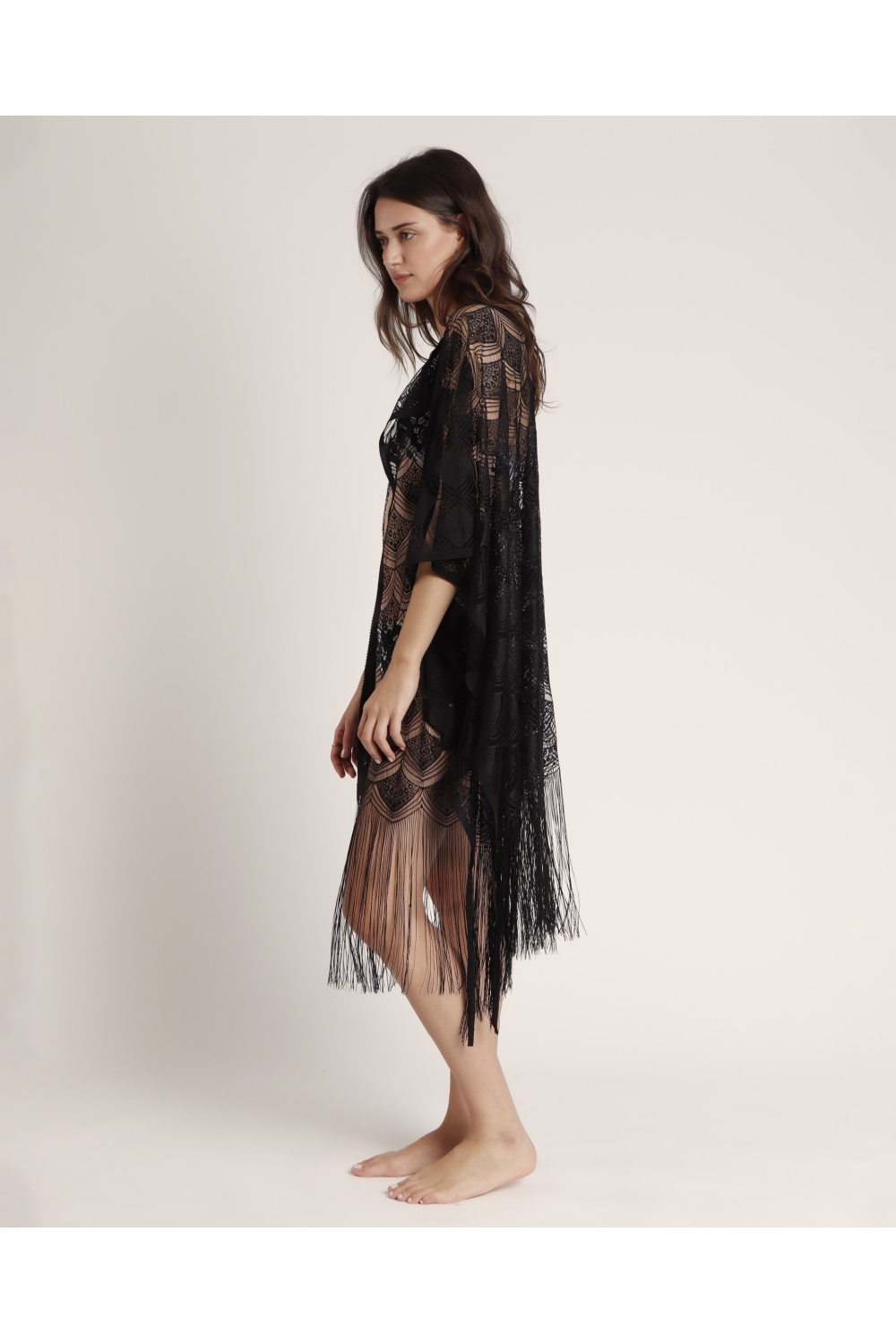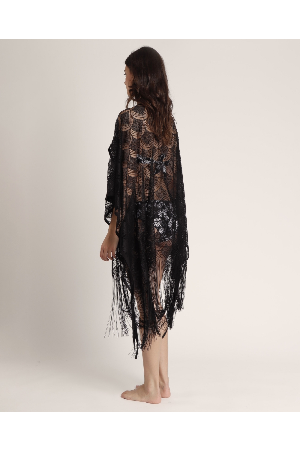 * Chal de playa para mujer tipo crochet con detalles de flecos, lo que le da un aire artesano a la prenda, de color negro.
