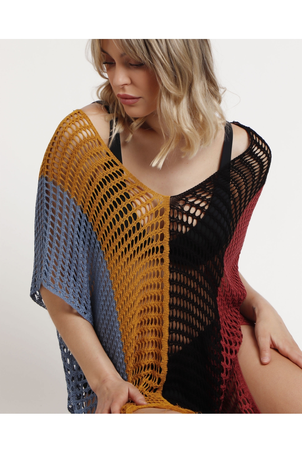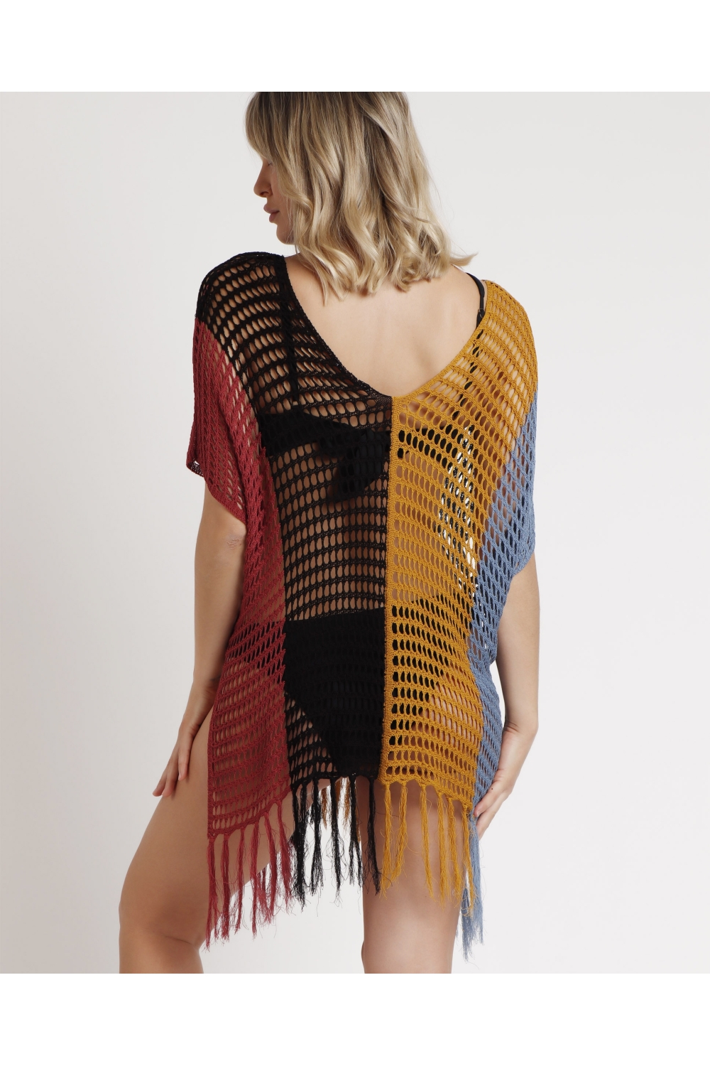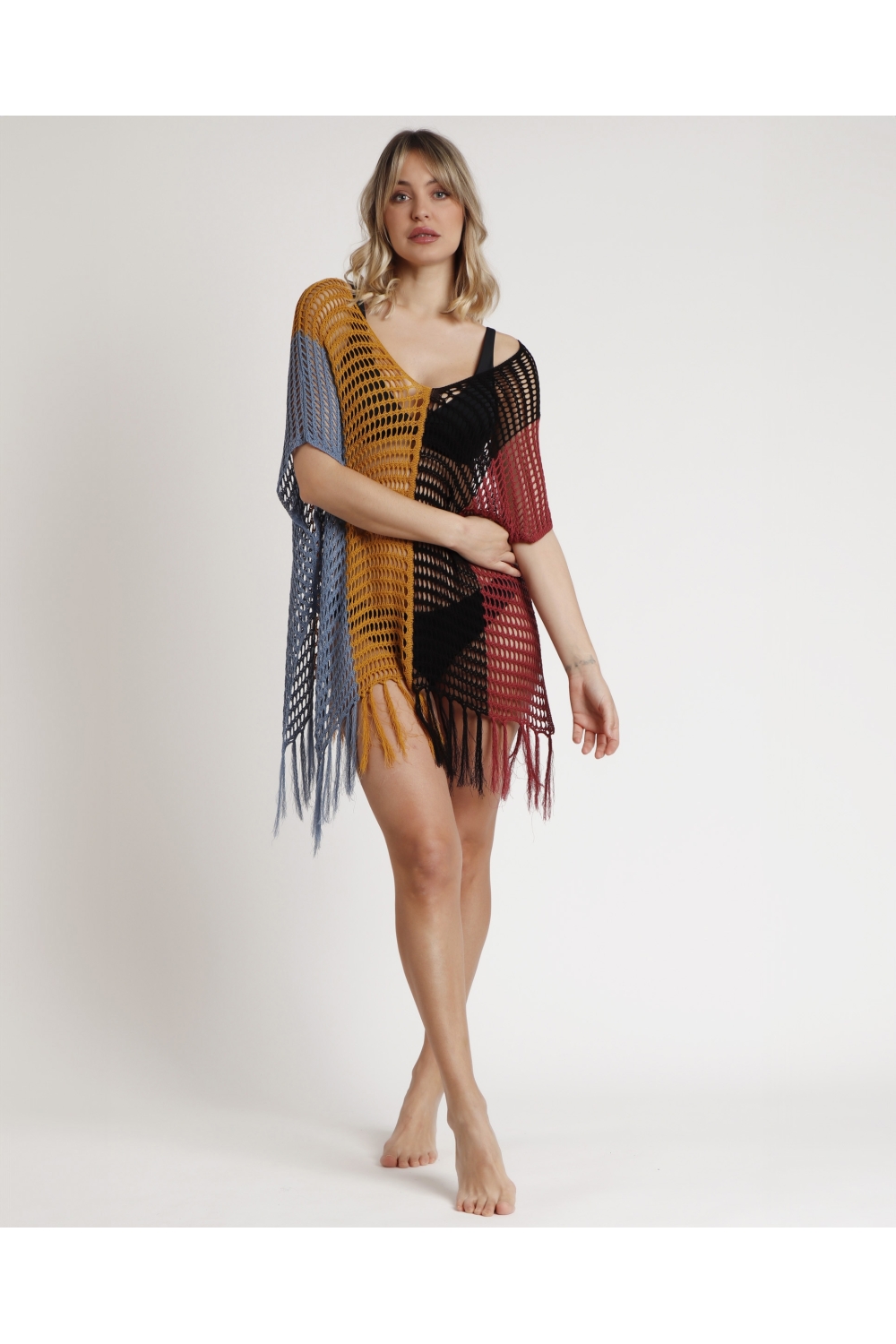 * Poncho de playa para mujer, de punto calado, cuello pico y con detalles de flecos en el bajo.