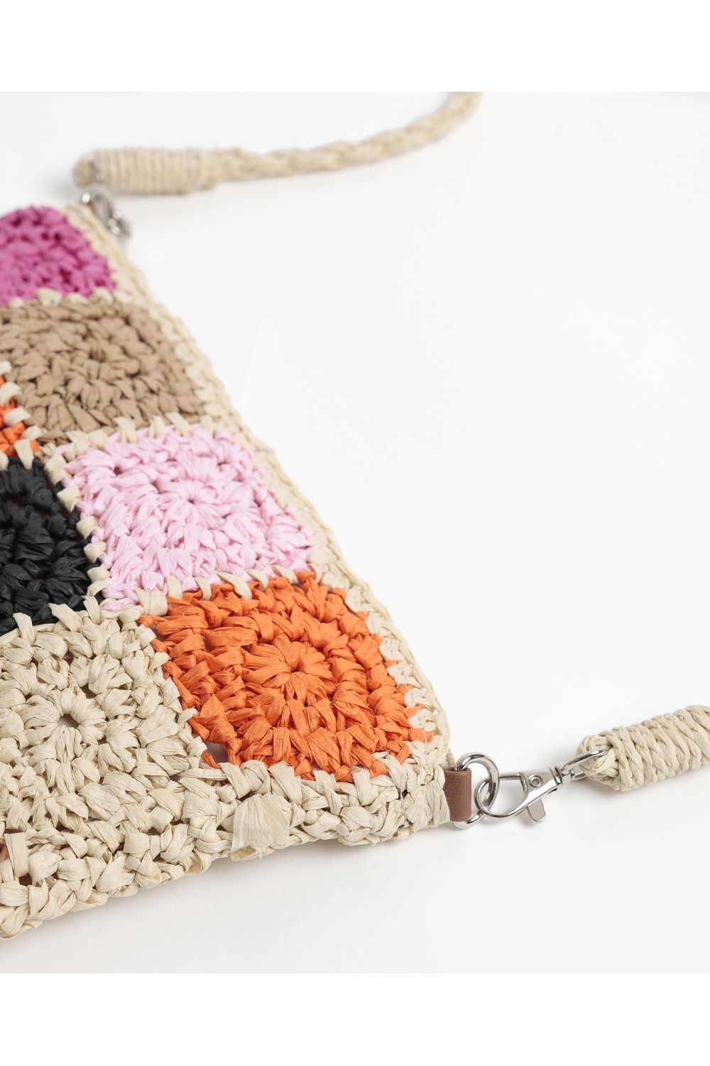 * Bolso de playa confeccionado con material tipo rafia multicolor, con asa.