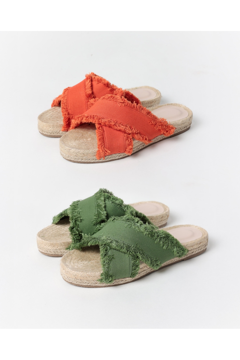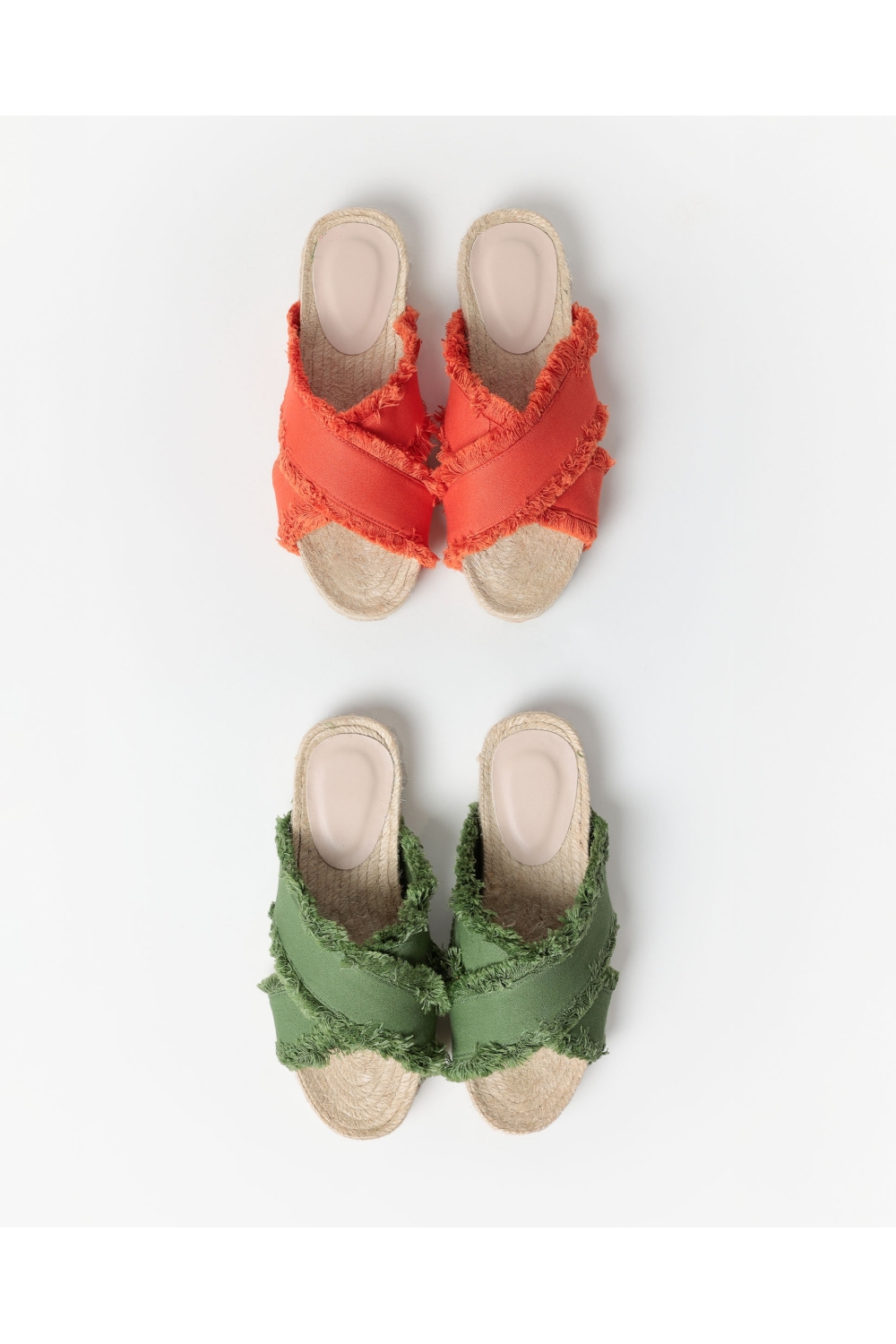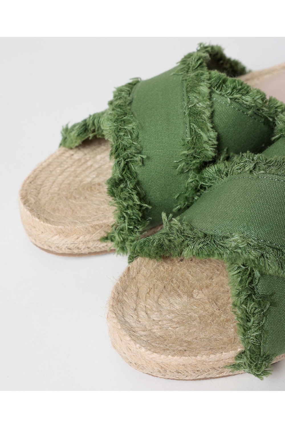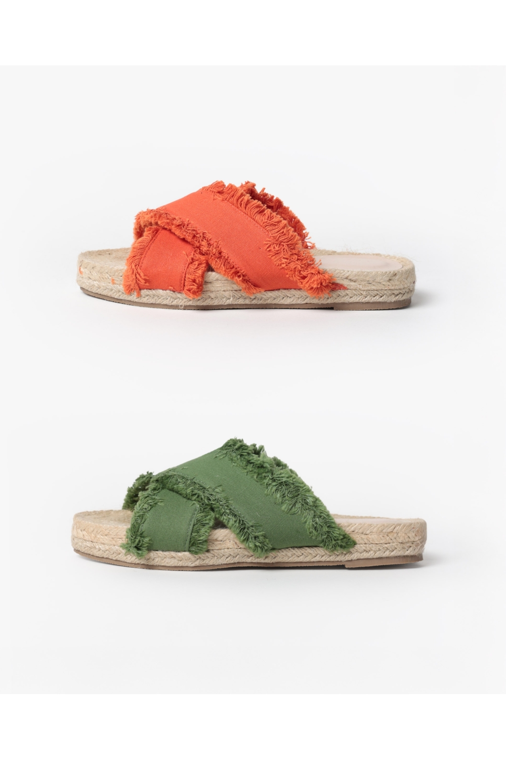 Sandalias de playa para mujer con detalle de flecos, en dos combinaciones de color: verde y caldera.