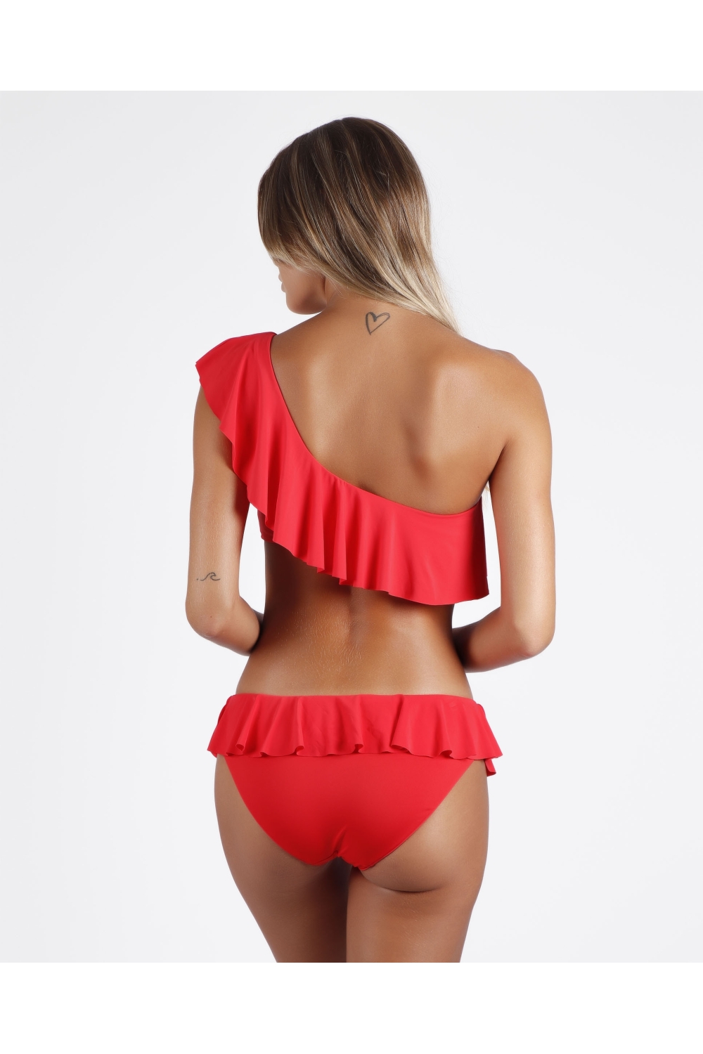 * Bikini asimétrico, de tejido de baño elástico, compuesto por dos piezas (top y braga) con detalles de volantes y en dos combinaciones de color: negro y rojo.