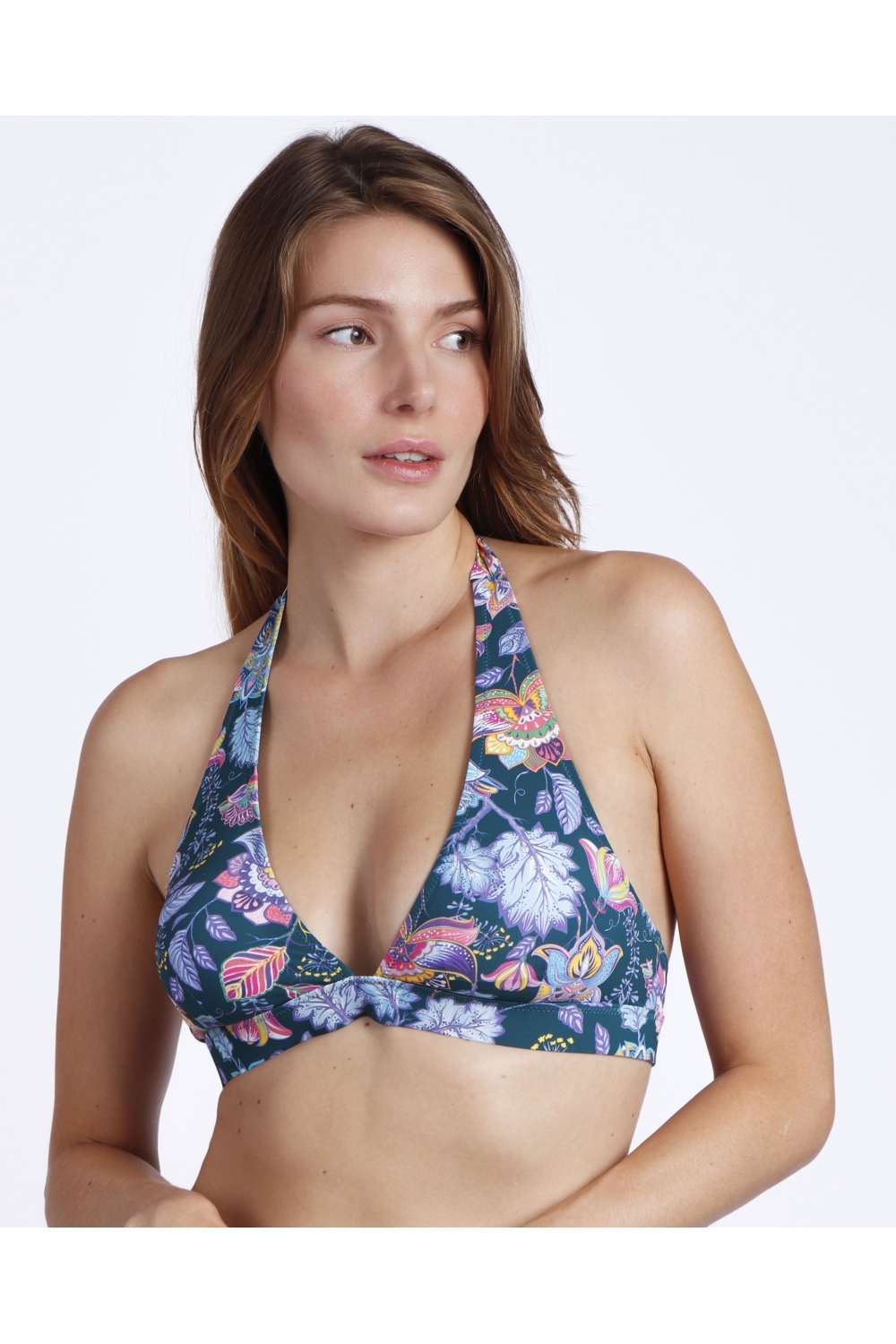 * Bikini halter, confeccionado en tejido de baño elástico, de estampado muy veraniego, compuesto por dos piezas (top atado y braga).