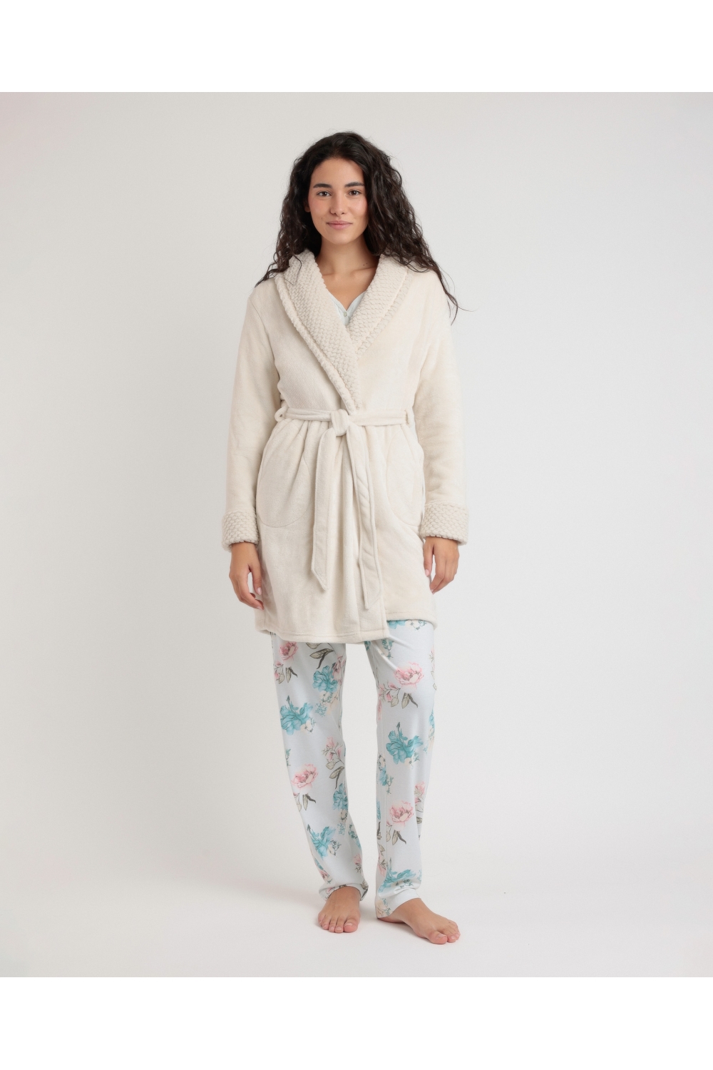 * Bata cruzada, de tejido especial Corel muy calentito, con bolsillos y en dos combinaciones de color: azul y piedra.