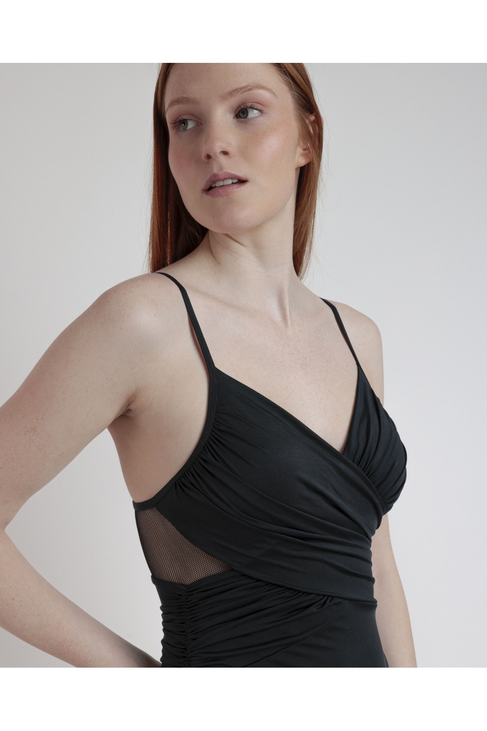 * Bañador drapeado, de tejido de baño elástico, con escote en V, en color negro.