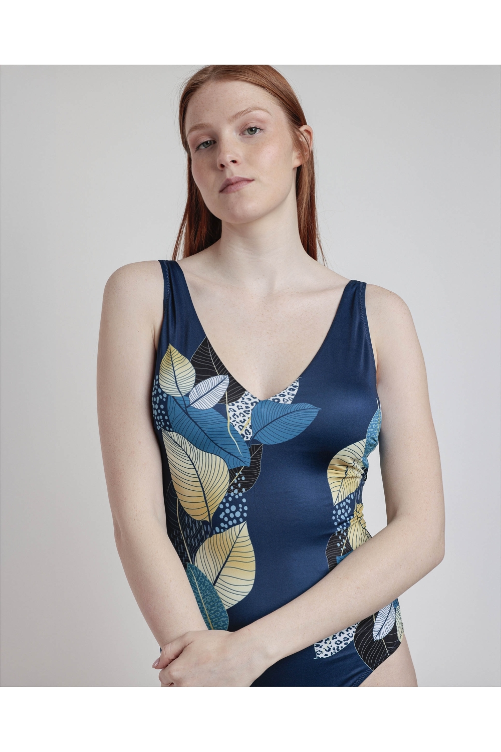 * Bañador copa triángulo confeccionado en tejido de baño elástico, con escote en V, de diseño veraniego, en color azul marino.