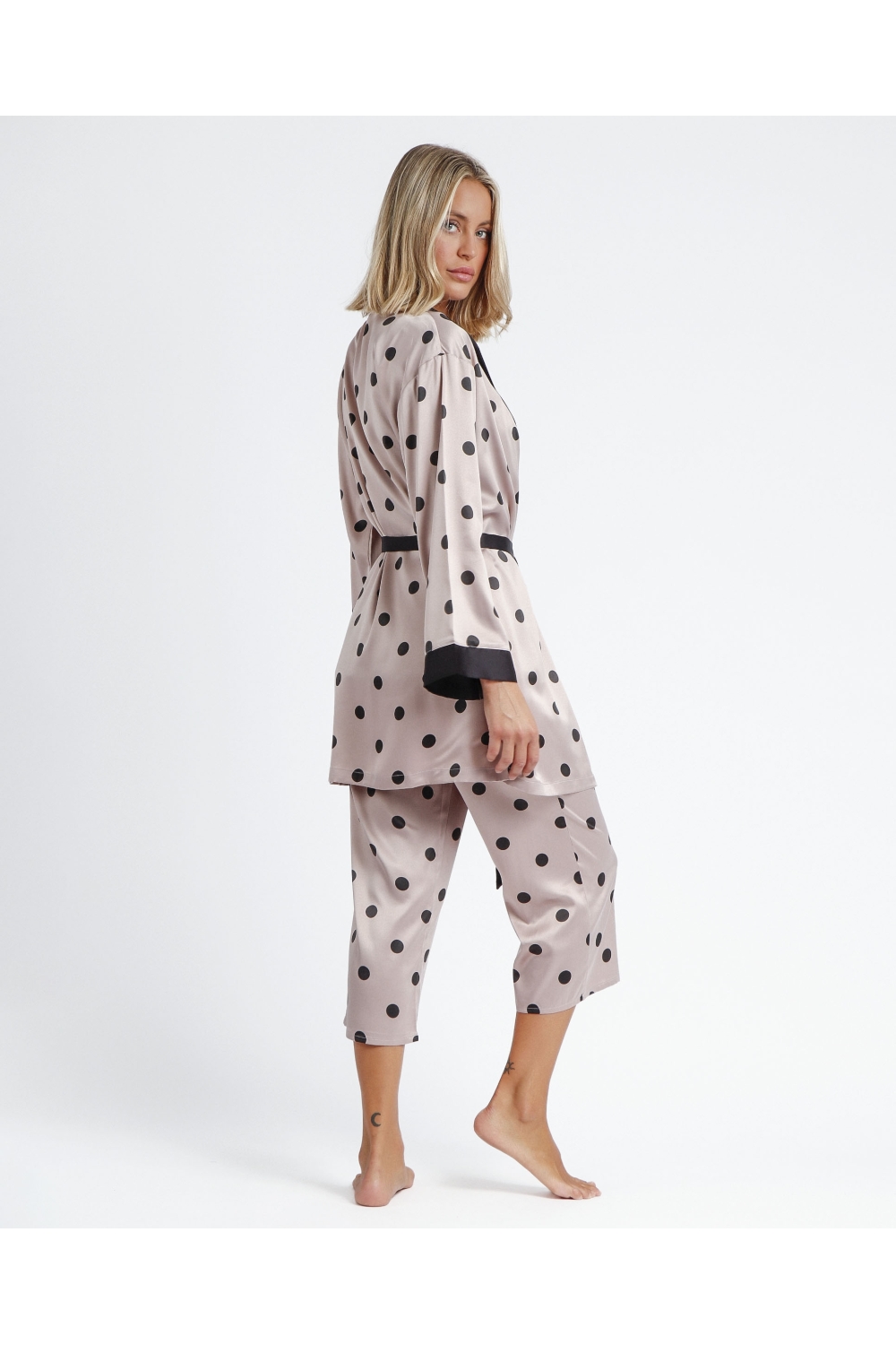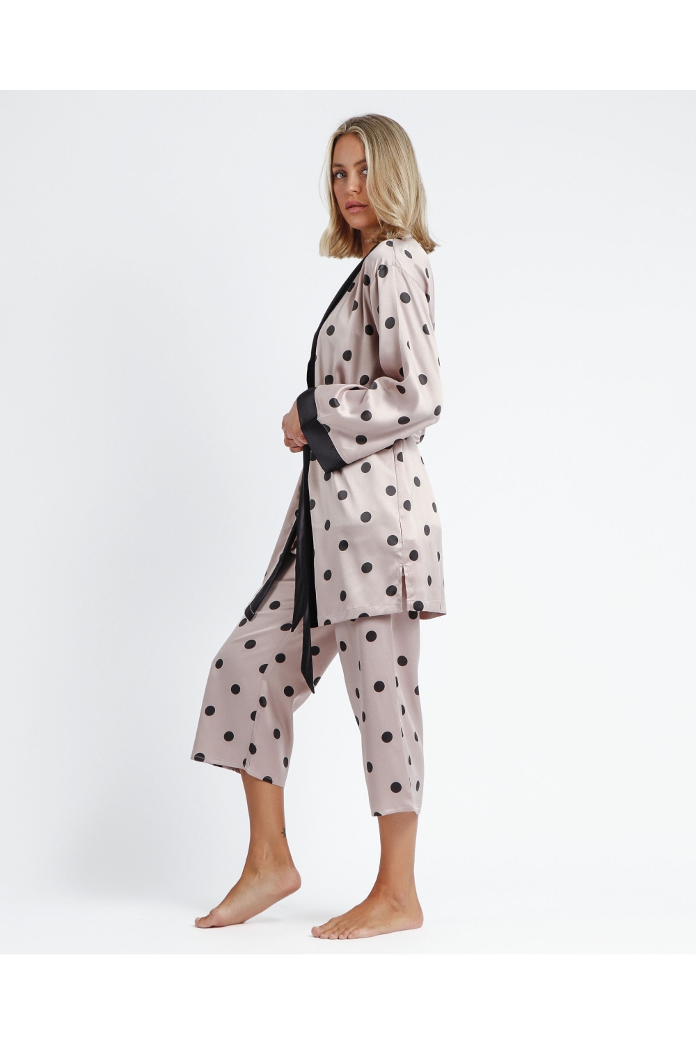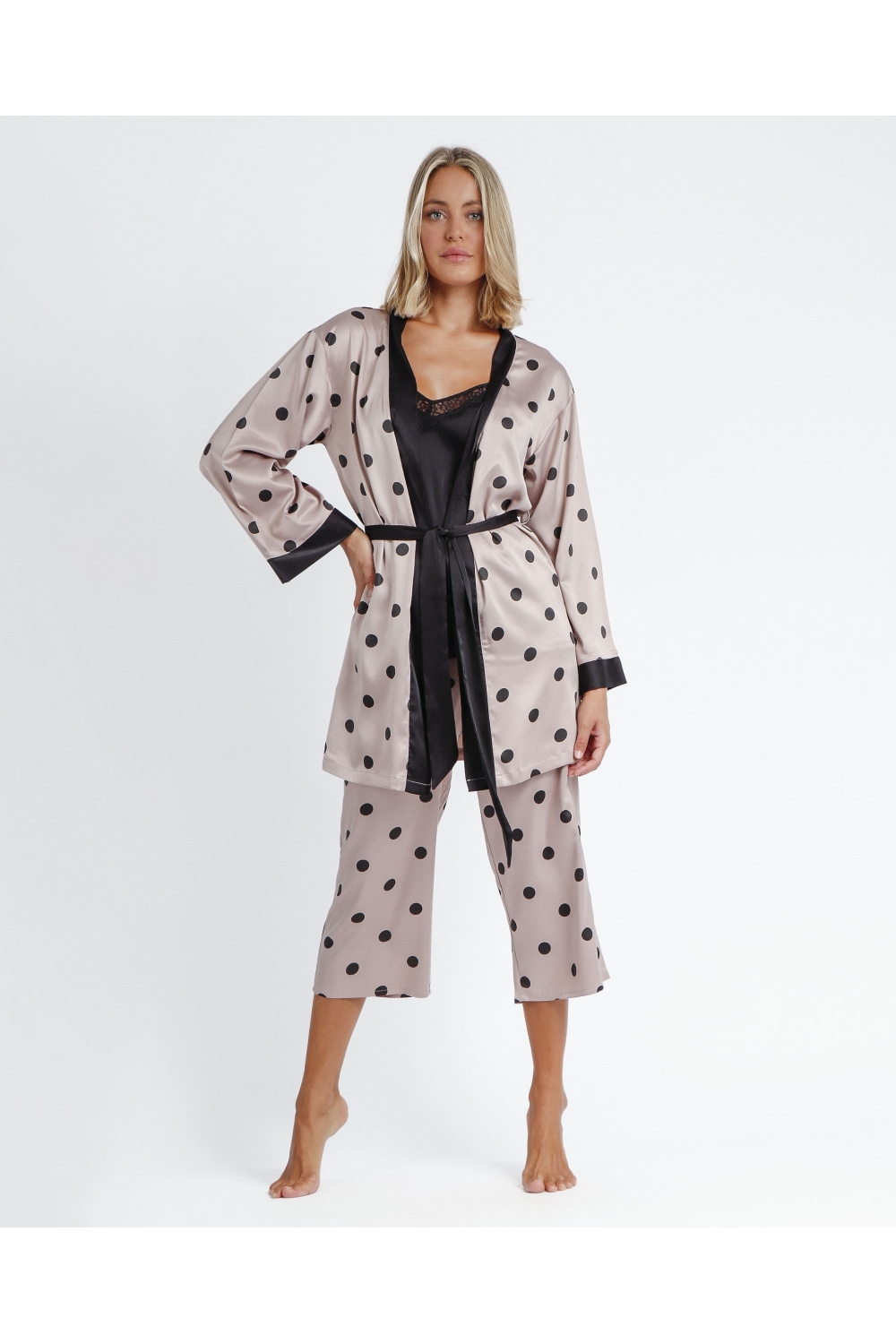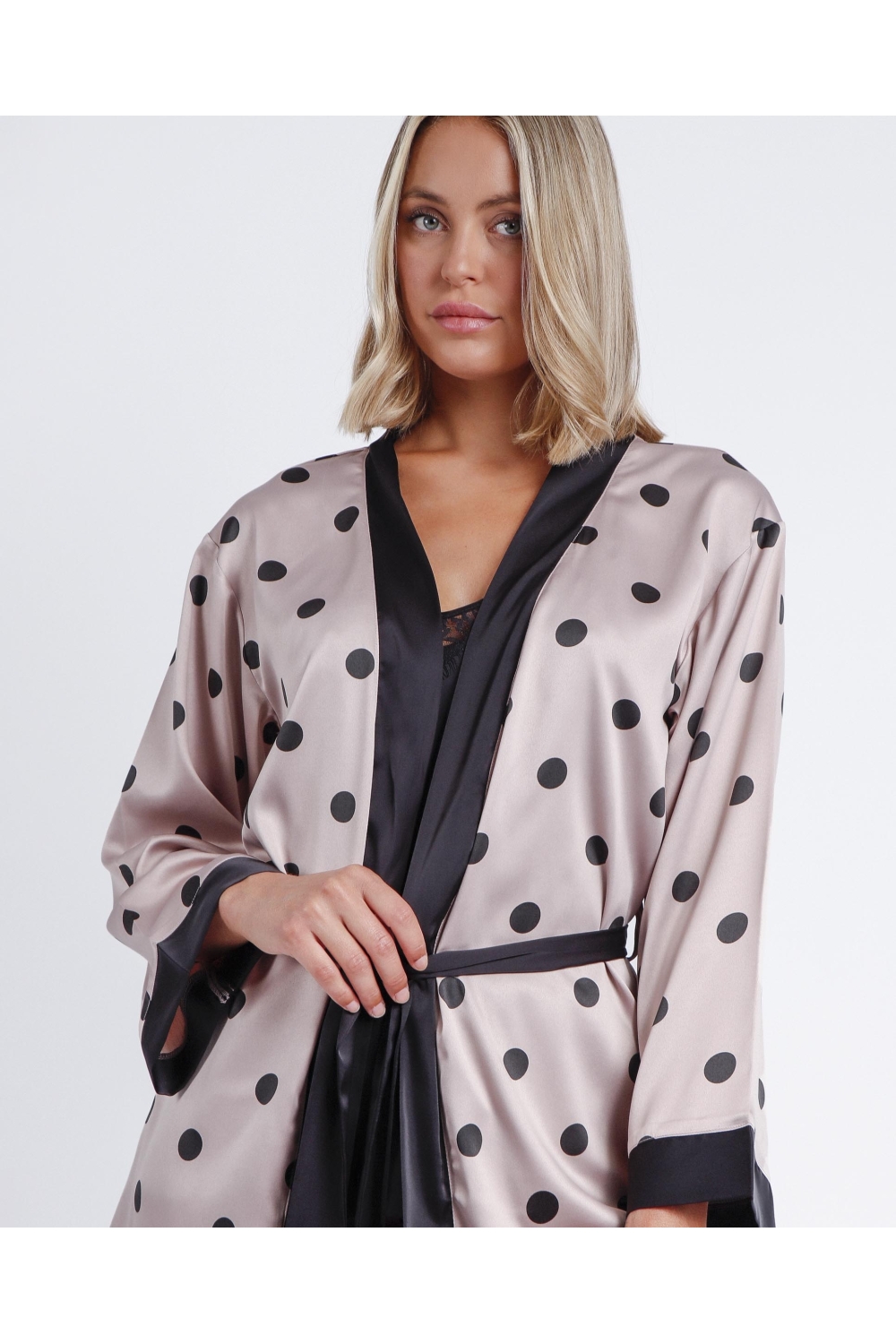 * Bata de tela satén, con diseño de topos, de manga larga, en dos combinaciones de color: negro y burdeos.
