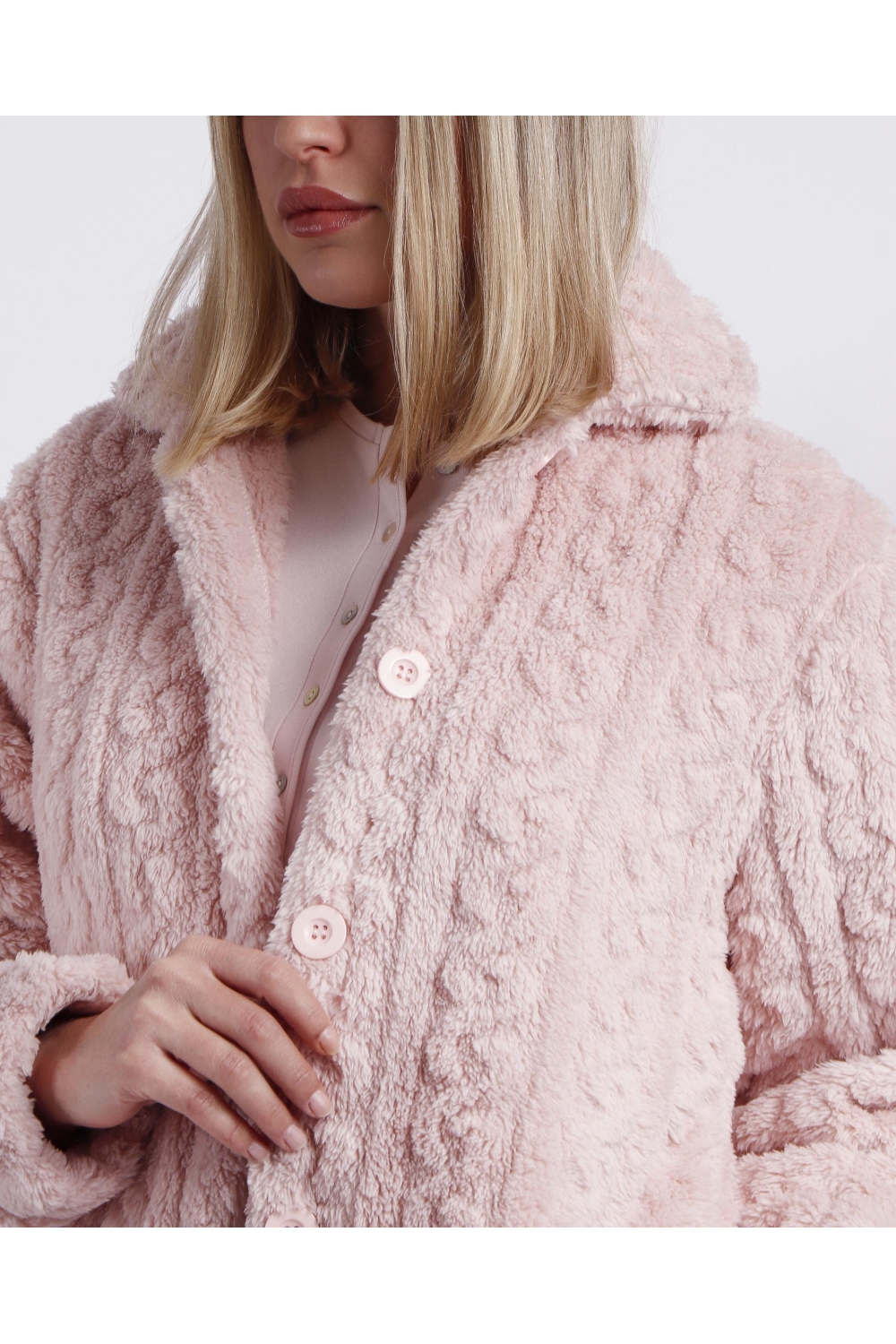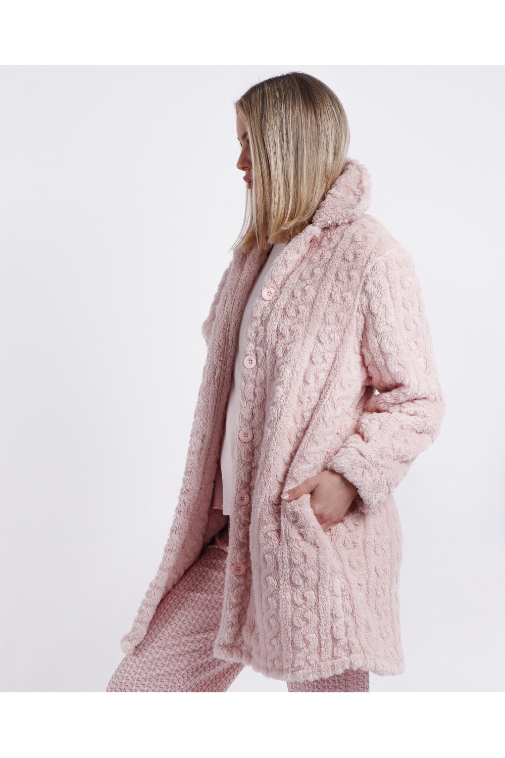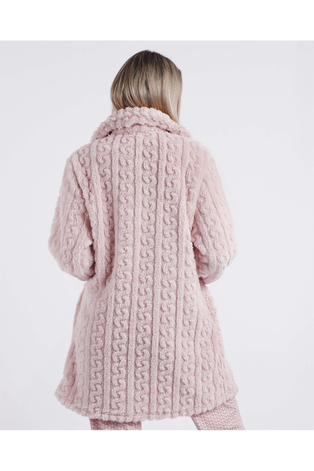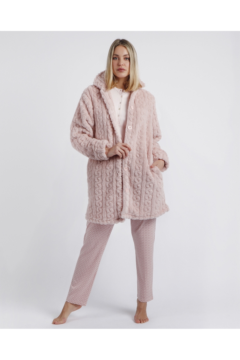 * Bata de tejido especial jacquard Corel muy calentito, en dos combinaciones de color: azul y pétalo.