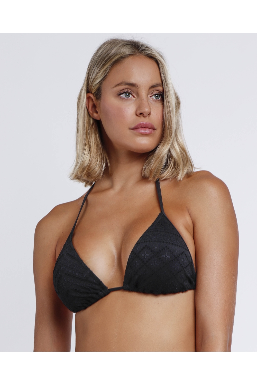 * Bikini triángulo atado, de tejido de baño calado elástico, compuesto por dos piezas (top atado y braga atada), en dos combinaciones de color: blanco y negro.