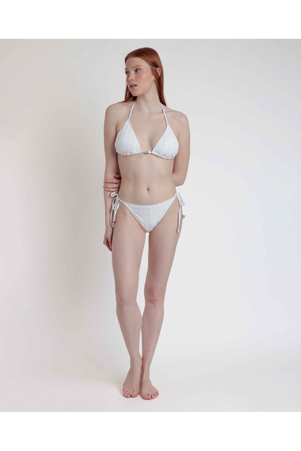 * Bikini triángulo, de tejido de baño elástico, compuesto por dos piezas (top atado y braga atada), en dos combinaciones de color: blanco y caldera.