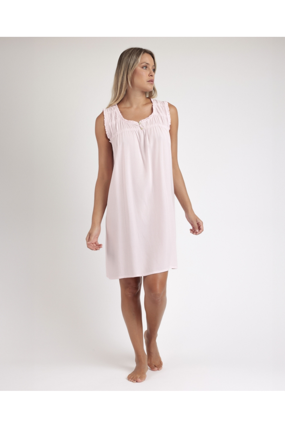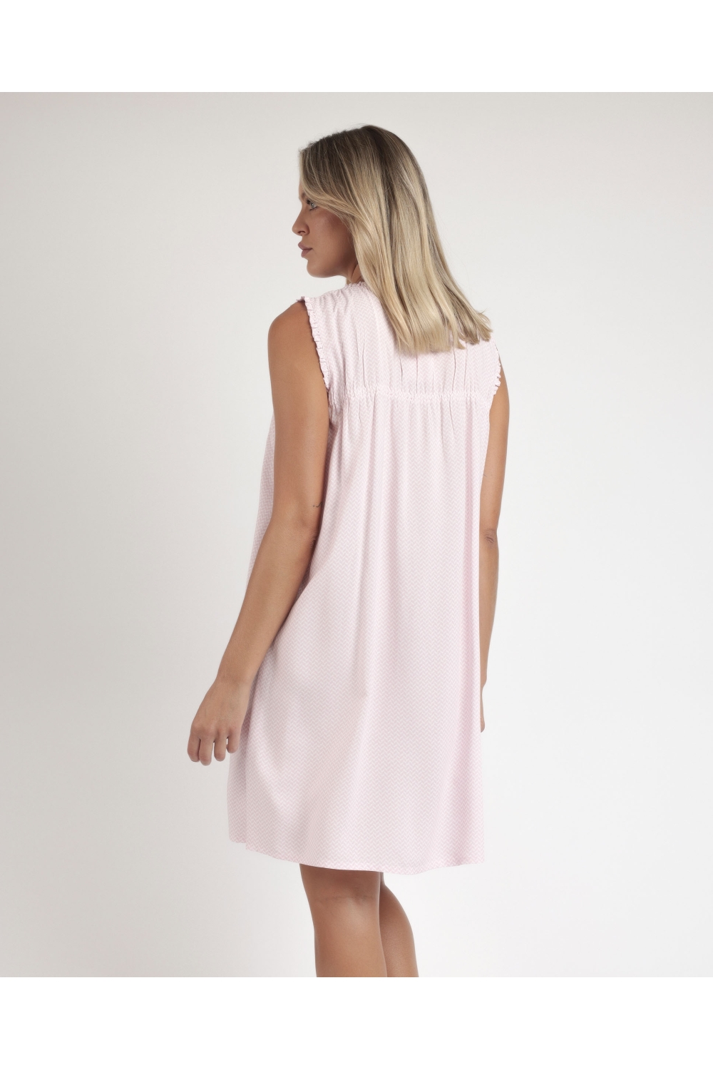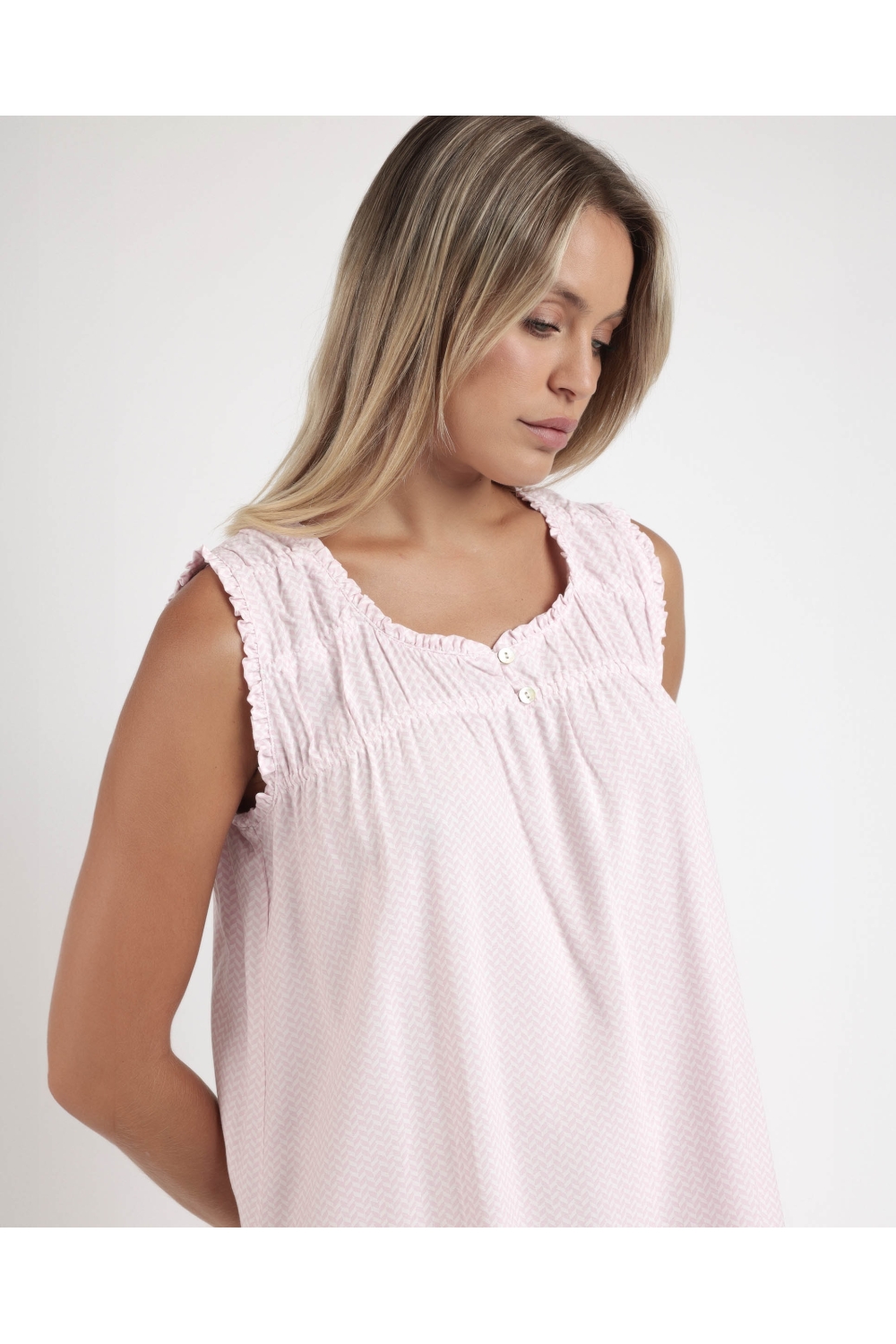 * Camisola de tela viscosa, sin mangas, escote con tapeta con botones y color rosa.