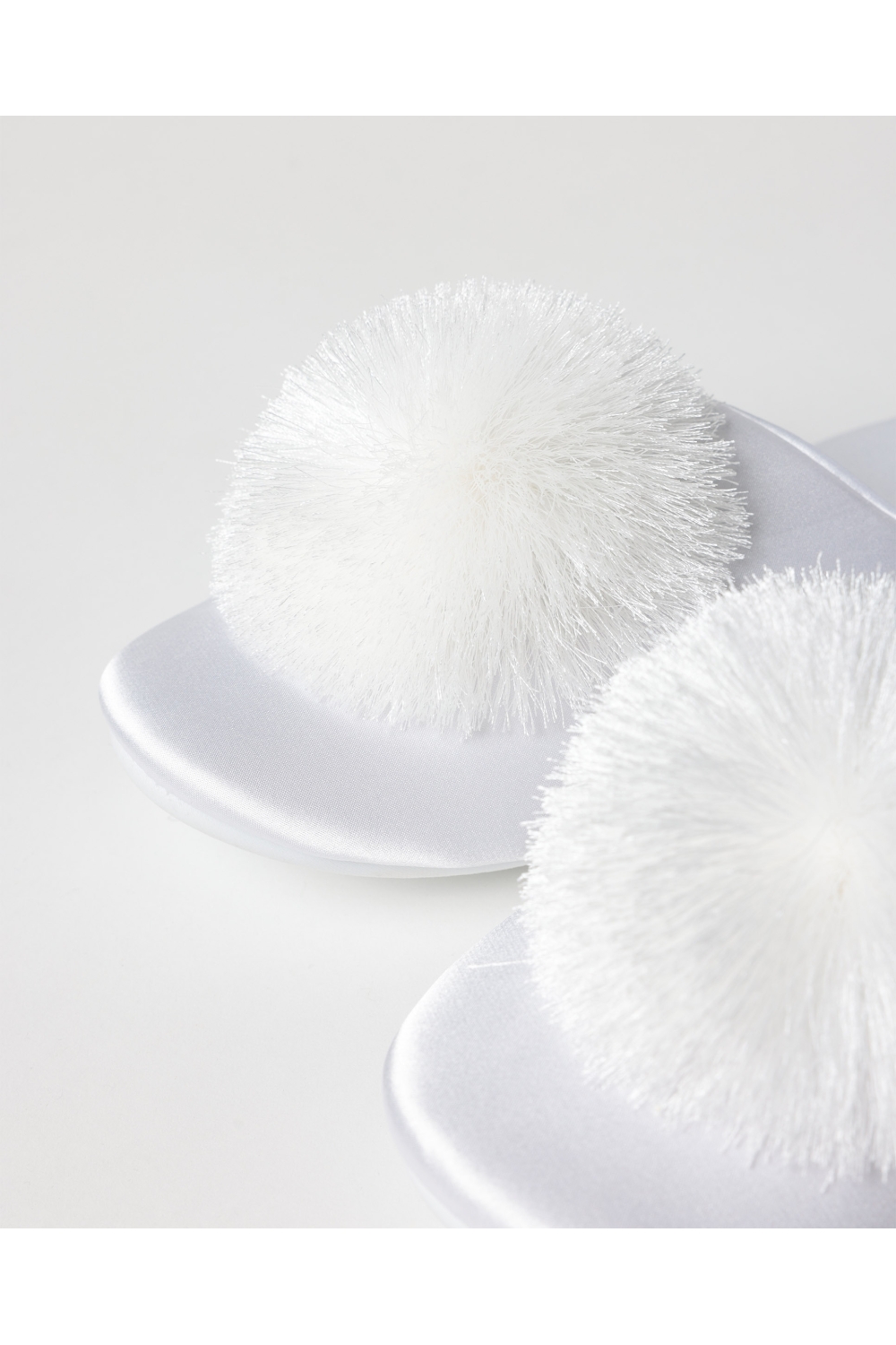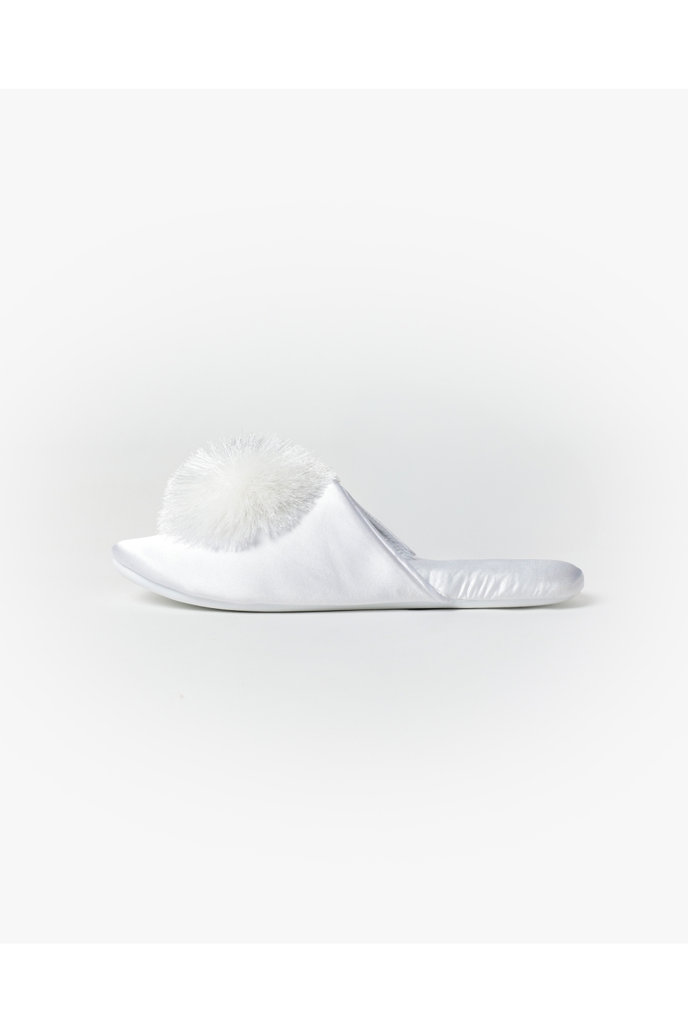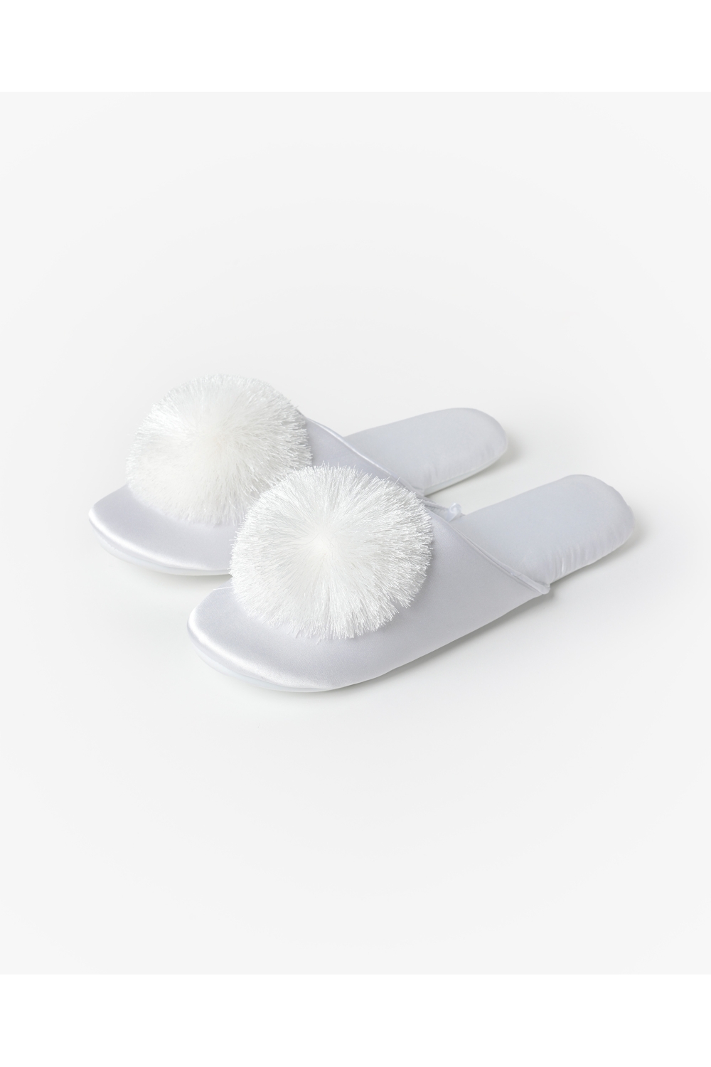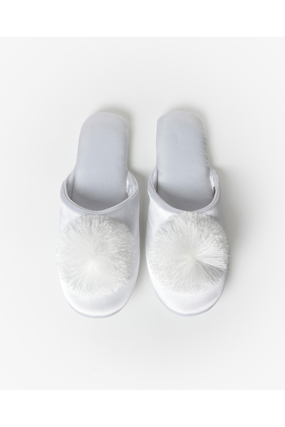 * Elegantes zapatillas de novia de satén, adornadas con un delicado pompón a tono, disponible en tres combinaciones de color: piedra, blanco y verde agua.