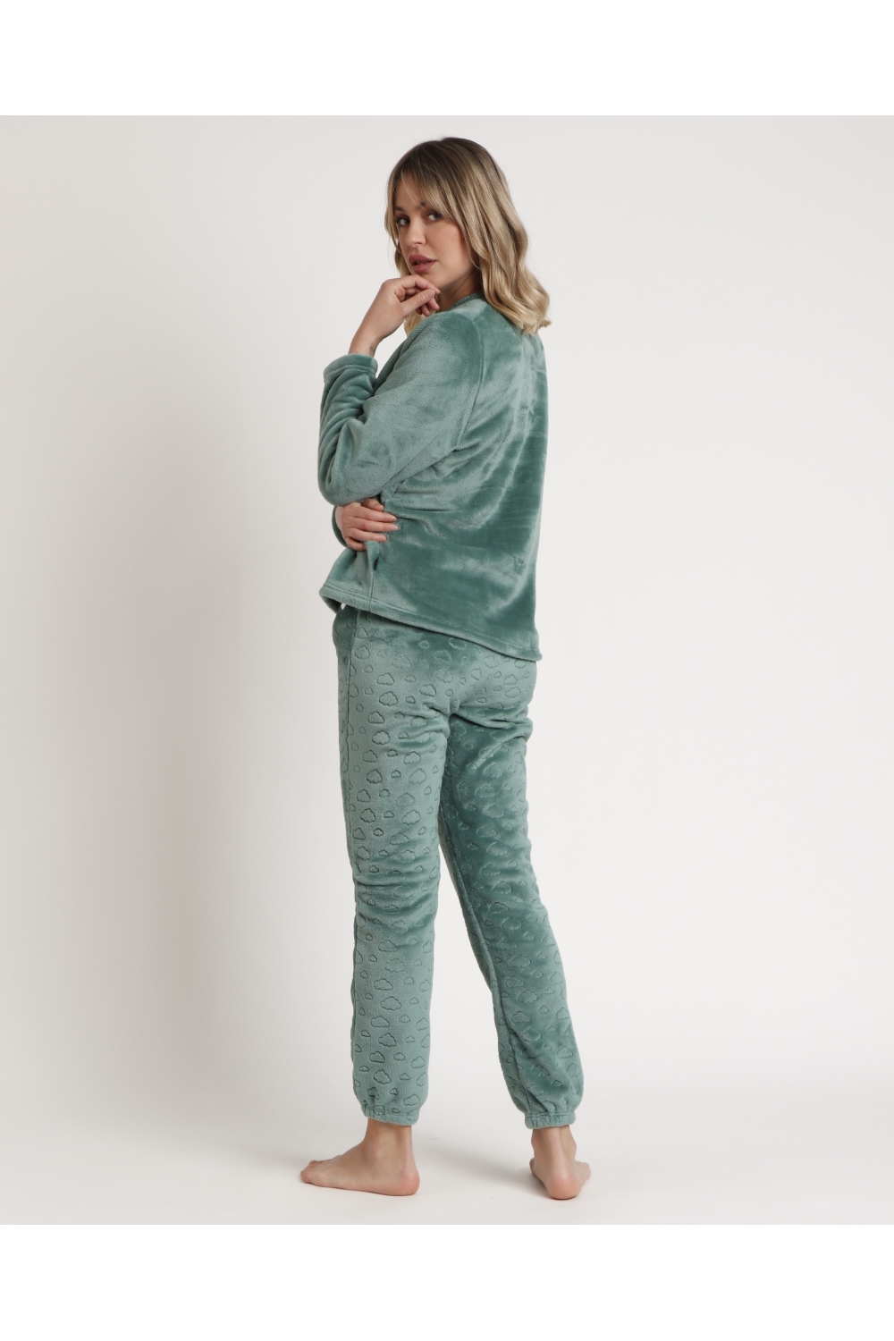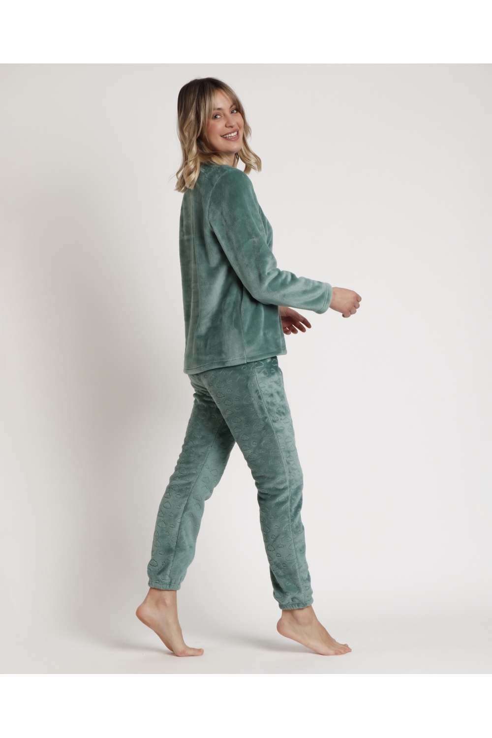 * Pijama de tejido calentito grueso corel, de manga larga, cuello redondo y pantalón largo.
