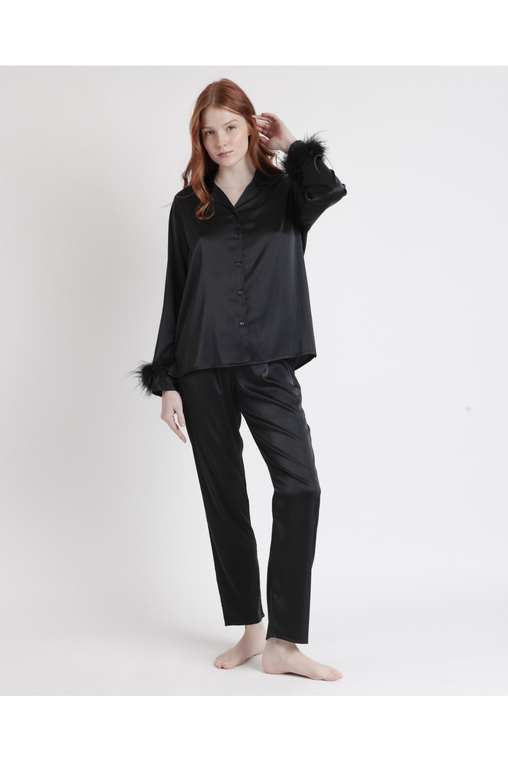 * Pijama abierto de tela satén, de manga larga y pantalón largo, en dos combinaciones de color: rojo y negro.