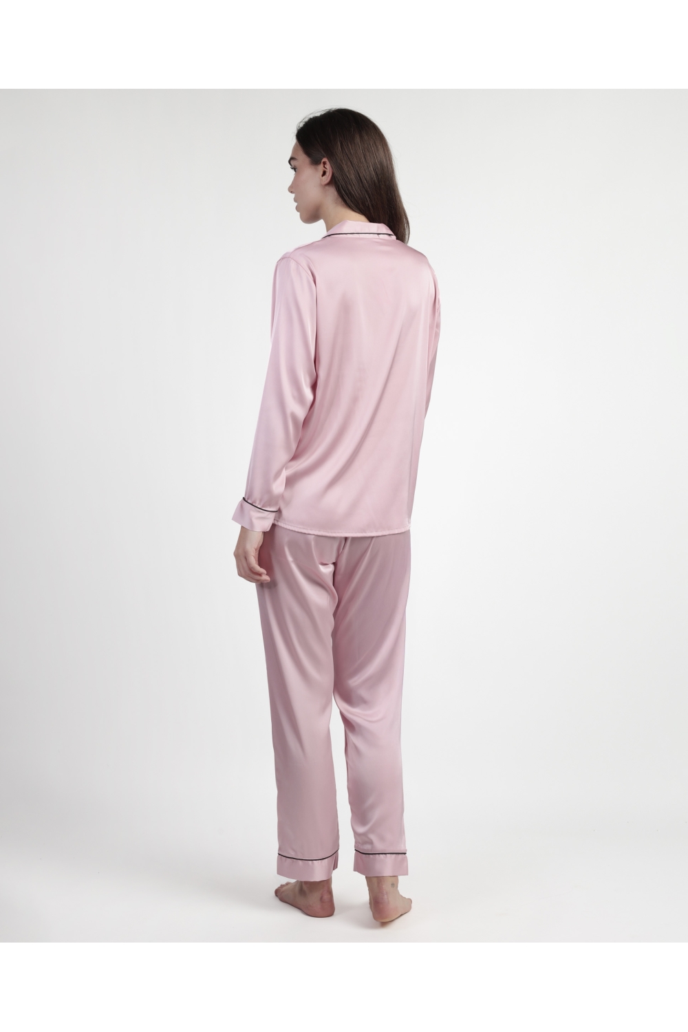 * Pijama abierto, de tela satén, de manga larga y pantalón largo, en dos combinaciones de color: fucsia y negro.