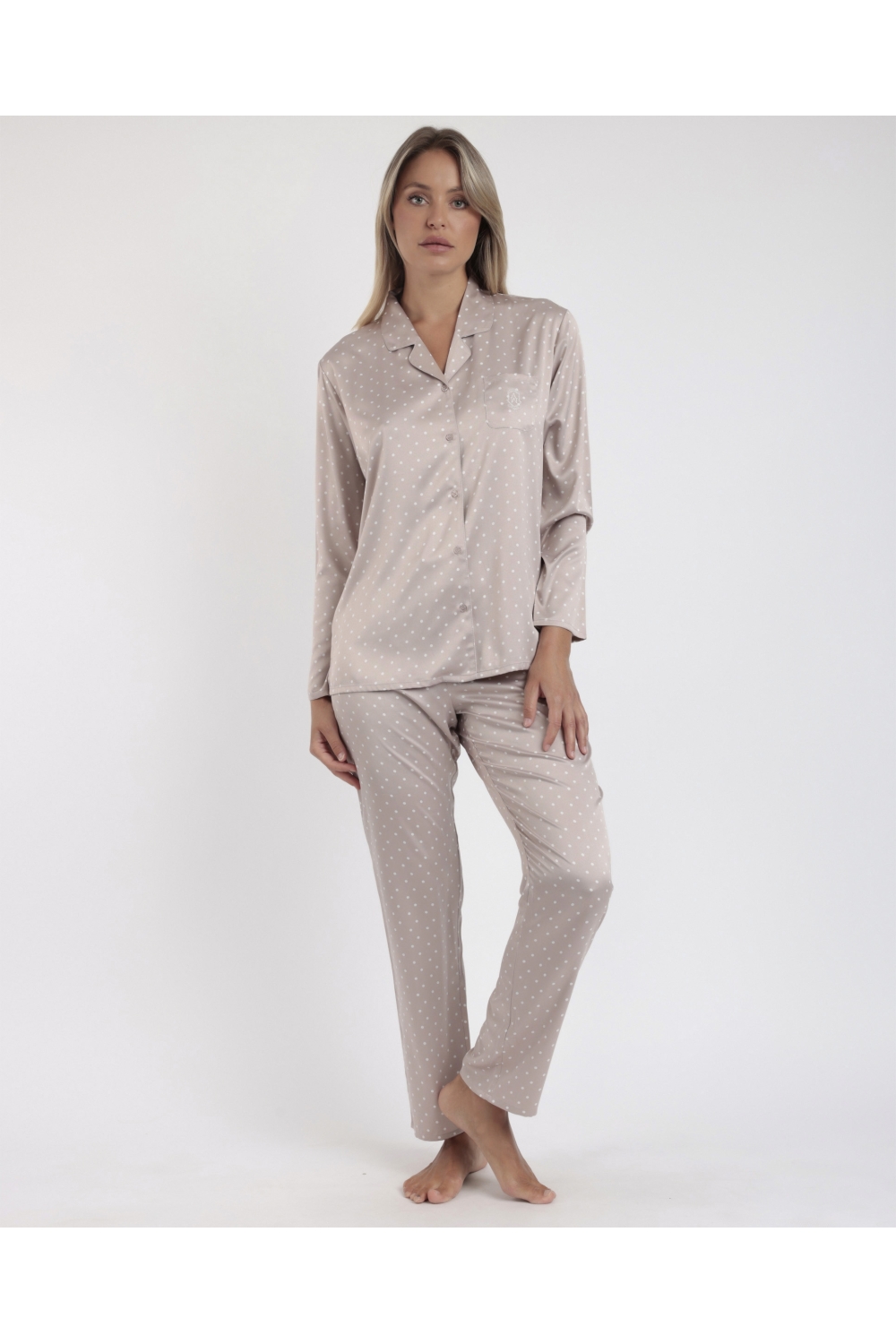 * Pijama abierto de tejido satén, de manga larga y pantalón largo.
