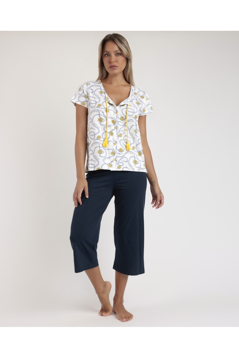* Pijama abierto de punto de algodón, de manga caída y pantalón palazzo.